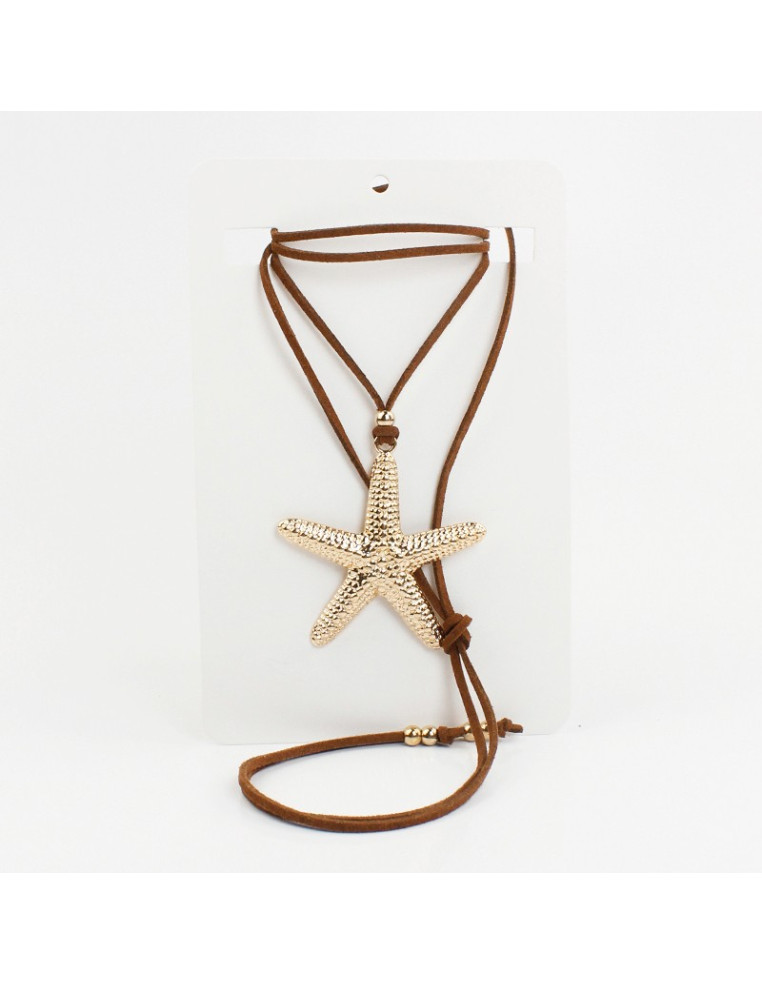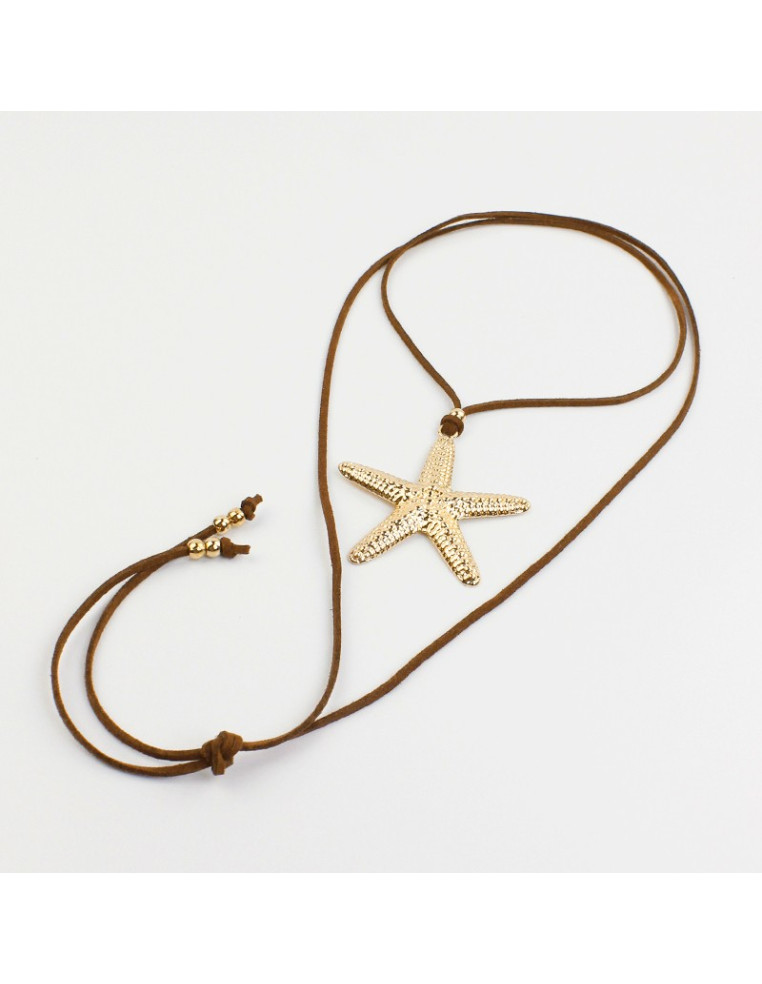 Collar de gamuza de múltiples vueltas, con dije exclusivo de fundición con forma de estrella marina y terminales en punteras. Medida: 140cm de largo.