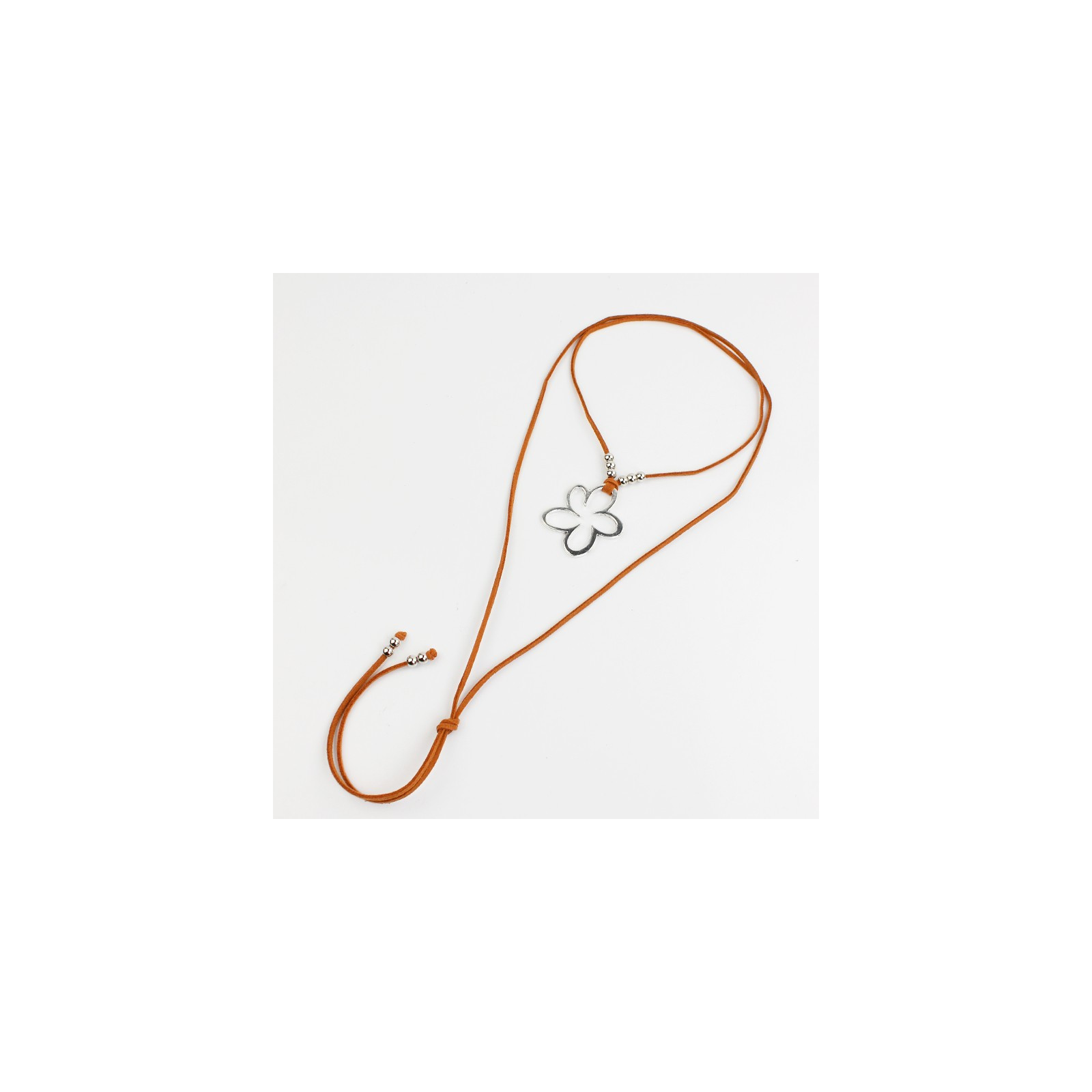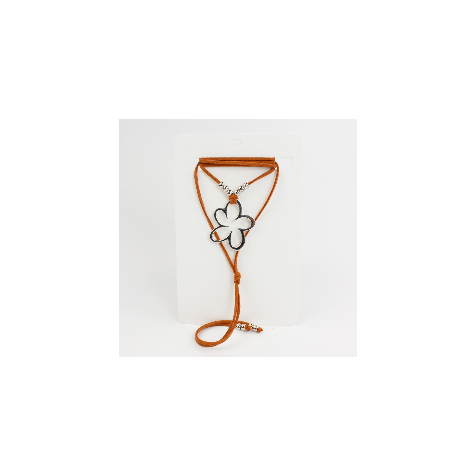 Collar de gamuza de múltiples vueltas, con dije exclusivo de fundición con forma de flor y terminales en punteras.
