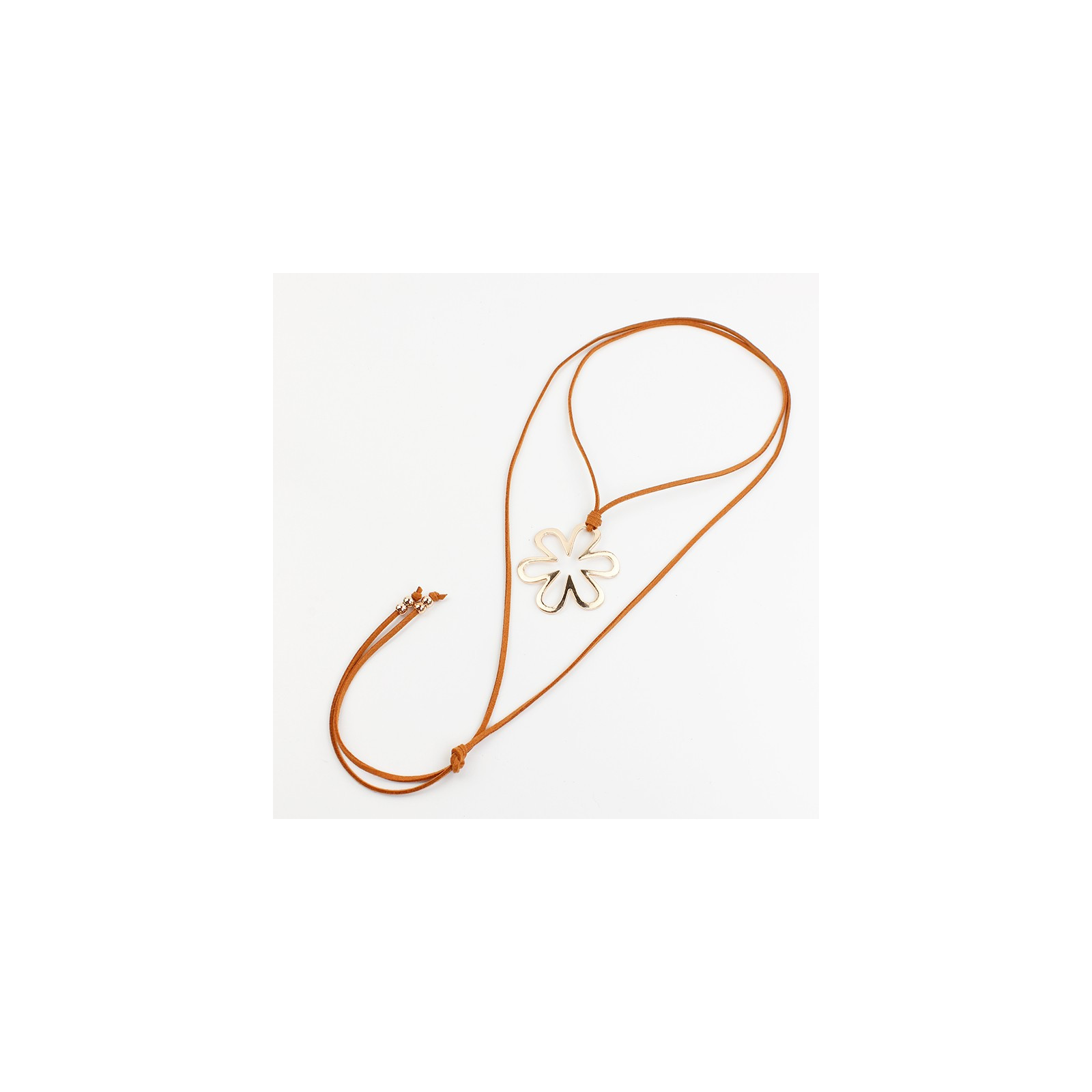 Collar de gamuza de múltiples vueltas, con dije exclusivo de fundición con forma de flor calada y terminales en punteras.