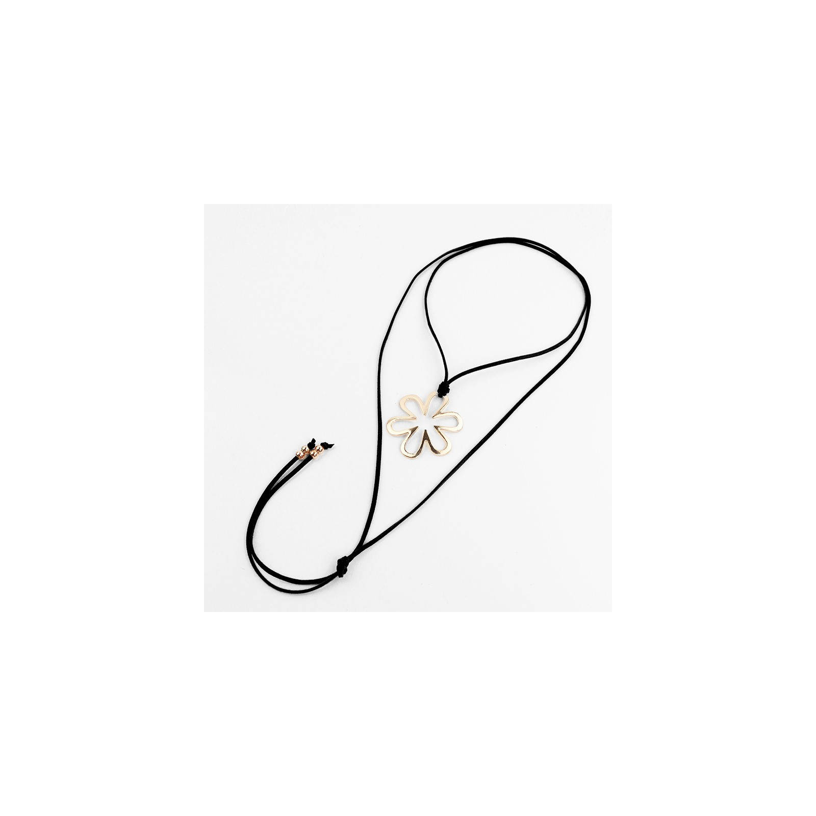 Collar de gamuza de múltiples vueltas, con dije exclusivo de fundición con forma de flor calada y terminales en punteras.