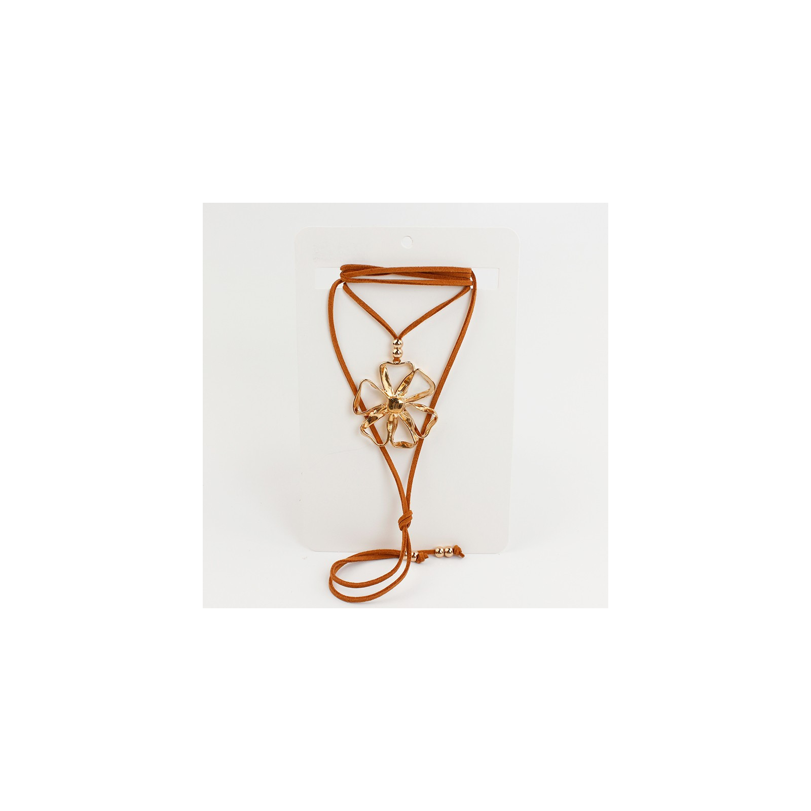 Collar de gamuza de múltiples vueltas, con dije exclusivo de fundición con forma de flor y terminales en punteras.