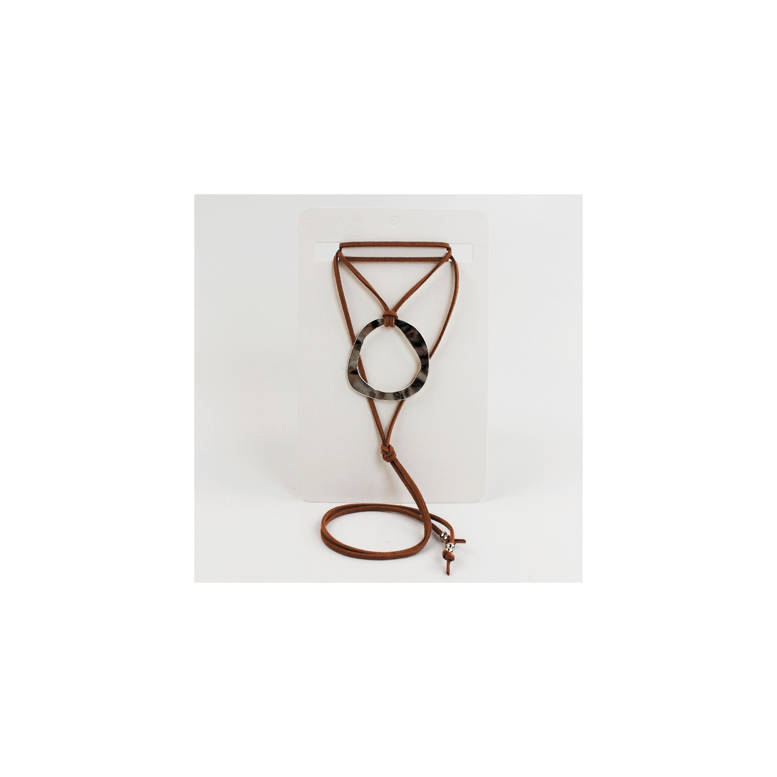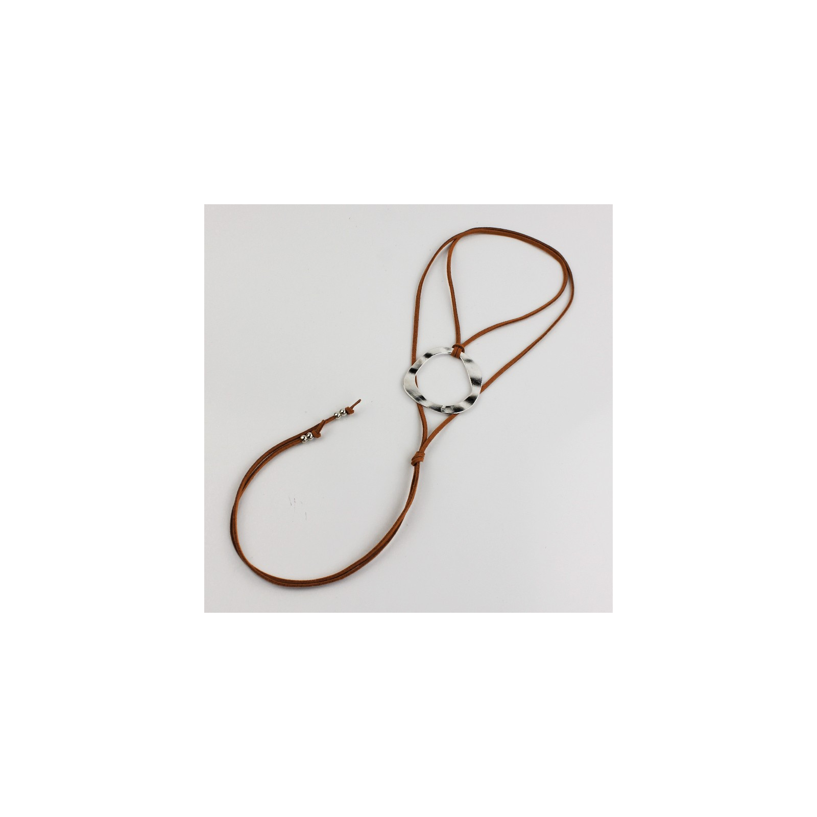 Collar de gamuza de múltiples vueltas, con dije exclusivo de chapa con forma orgánica y terminales en punteras.