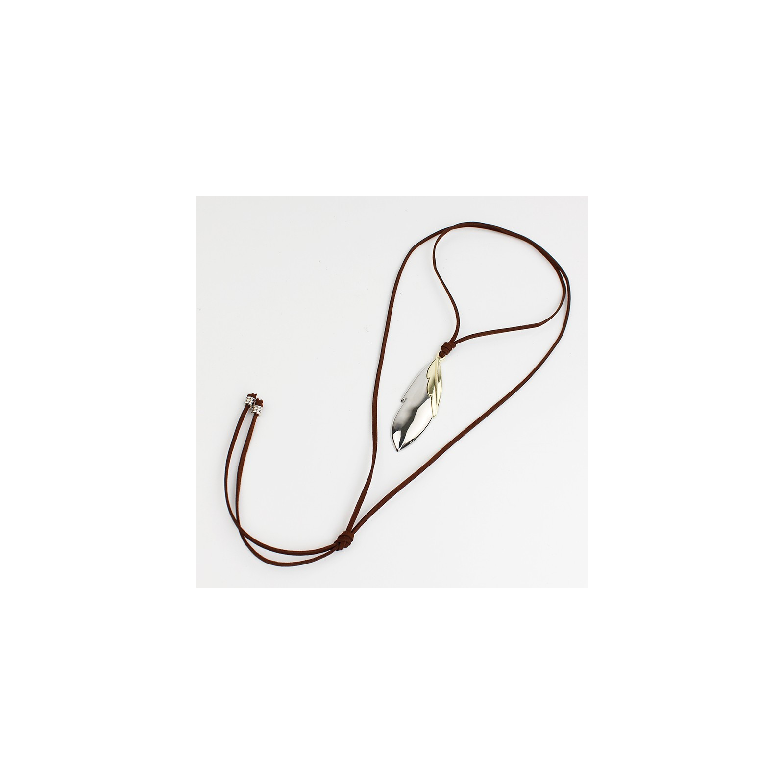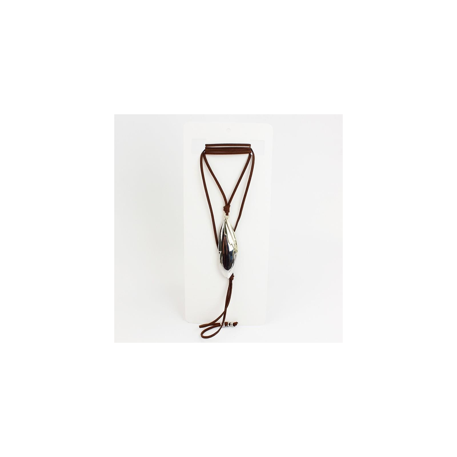 Collar de gamuza de múltiples vueltas, con dije exclusivo de metal con forma de pluma y terminales en punteras.