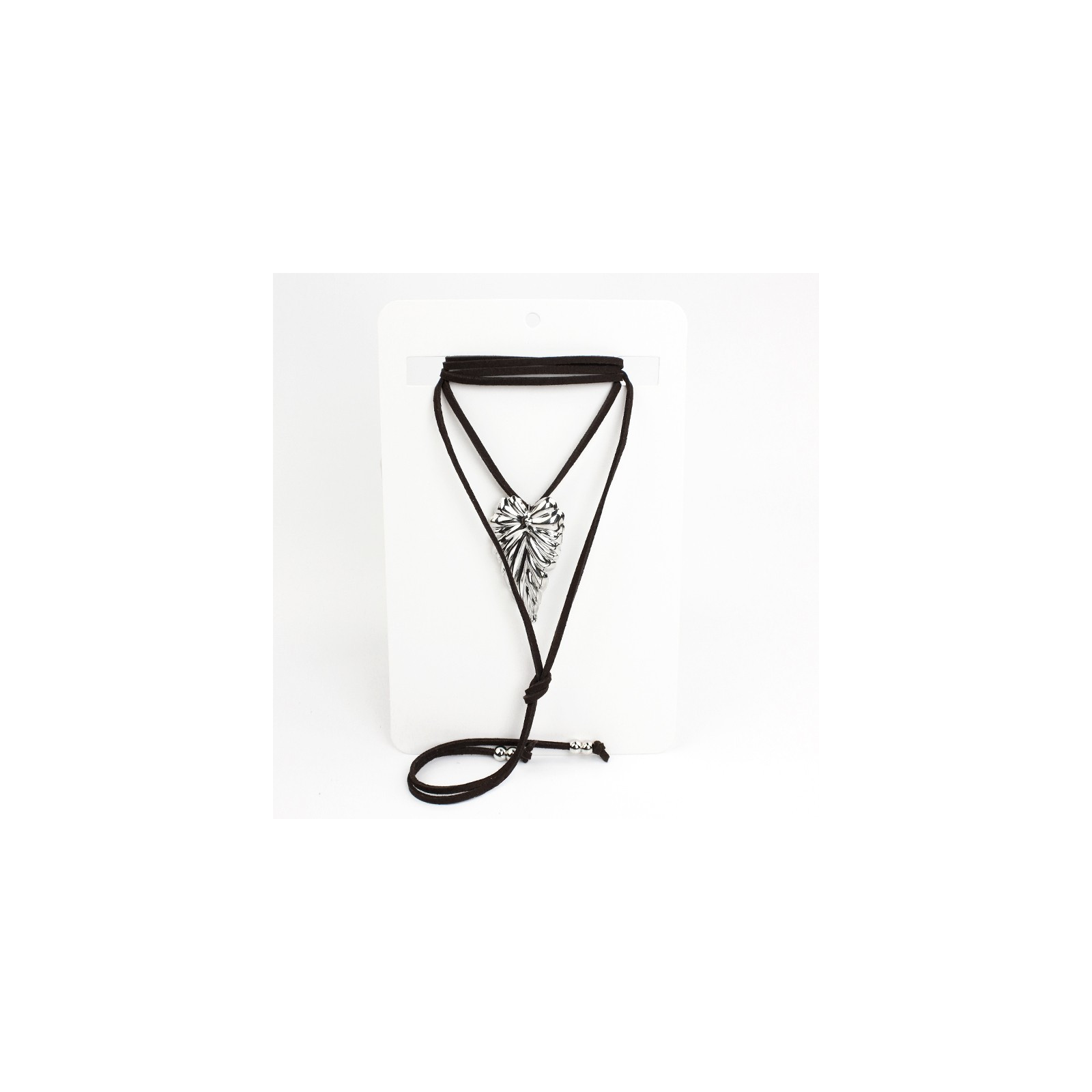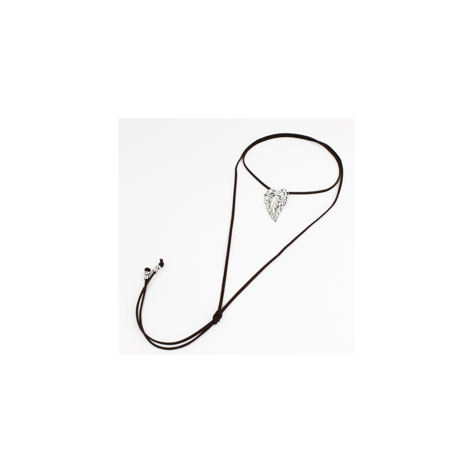 Collar de gamuza de múltiples vueltas, con dije exclusivo de metal con forma de hoja y terminales en punteras.
