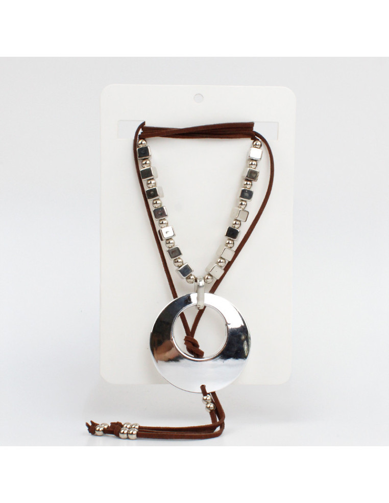 Collar de gamuza de múltiples vueltas, con dije circular, pasantes de CCB y terminales en punteras. Medida: 140cm de largo.