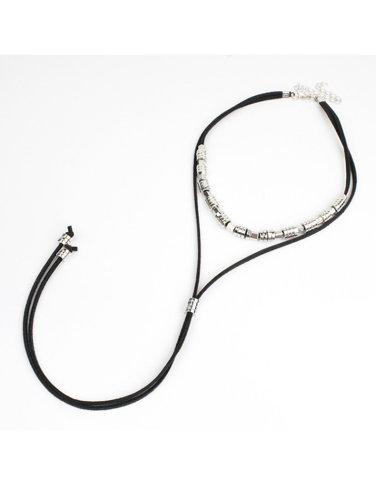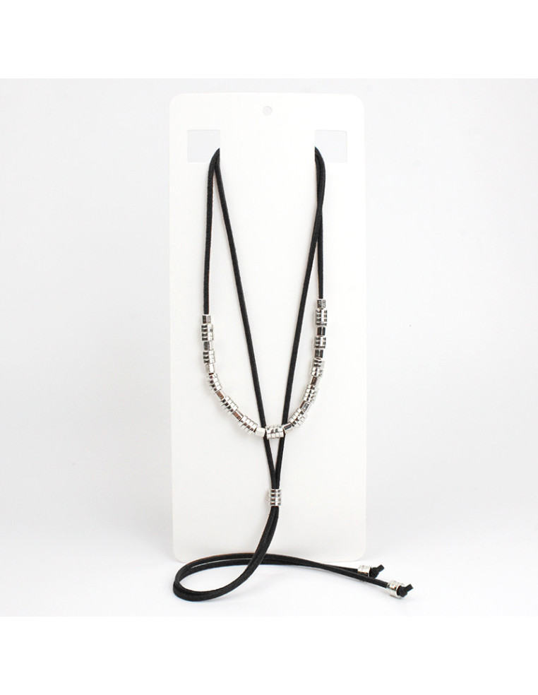 Collar corbatero de gamuza con múltiples piezas de ccb. Medida: 37cm con caída de 26cm mar largo ajustable con cadena de enganche de 10cm.