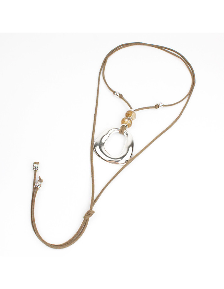 Collar de gamuza de múltiples vueltas, con dije, piezas de acrílico y terminales en punteras.
