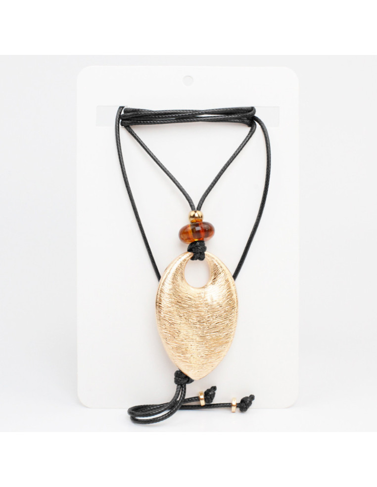 Collar de cordón de múltiples vueltas, con dije de fundición dorado, cuenta de acrílico y terminales en punteras.Medida: 140cm de largo.