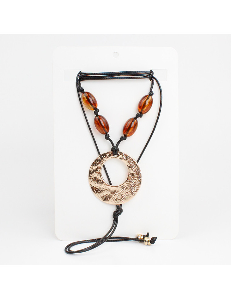 Collar de cordón encerado con dije de fundición, cuentas de acrílico pasantes y terminales en punteras.