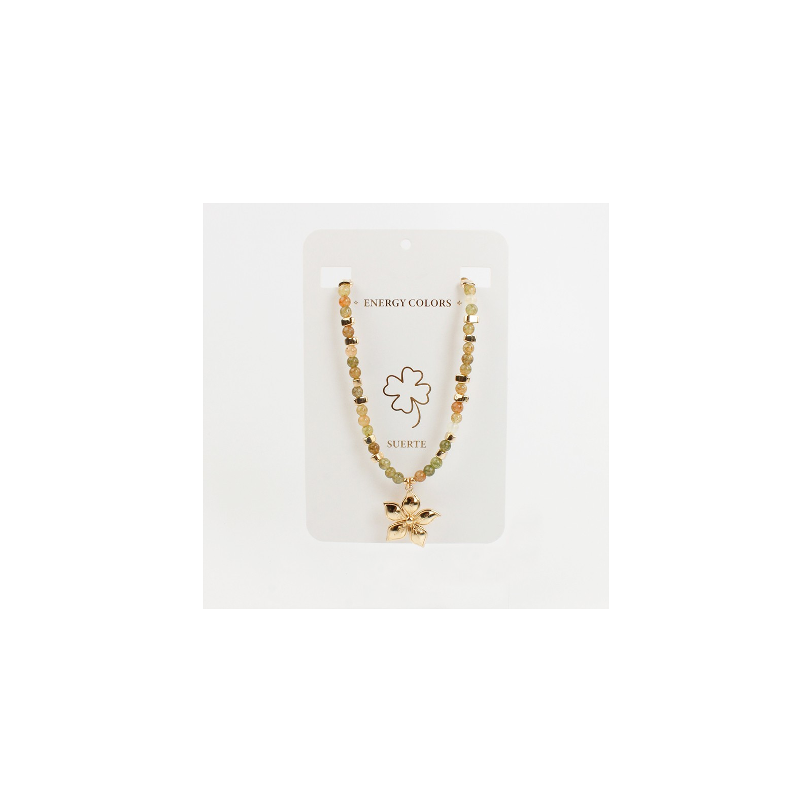 Collar flexible de lenga enhebrado con bolitas de vidrio energéticas estalladas, combinadas con piezas pasantes de CCB y dije exclusivo de fundición con forma de flor.
