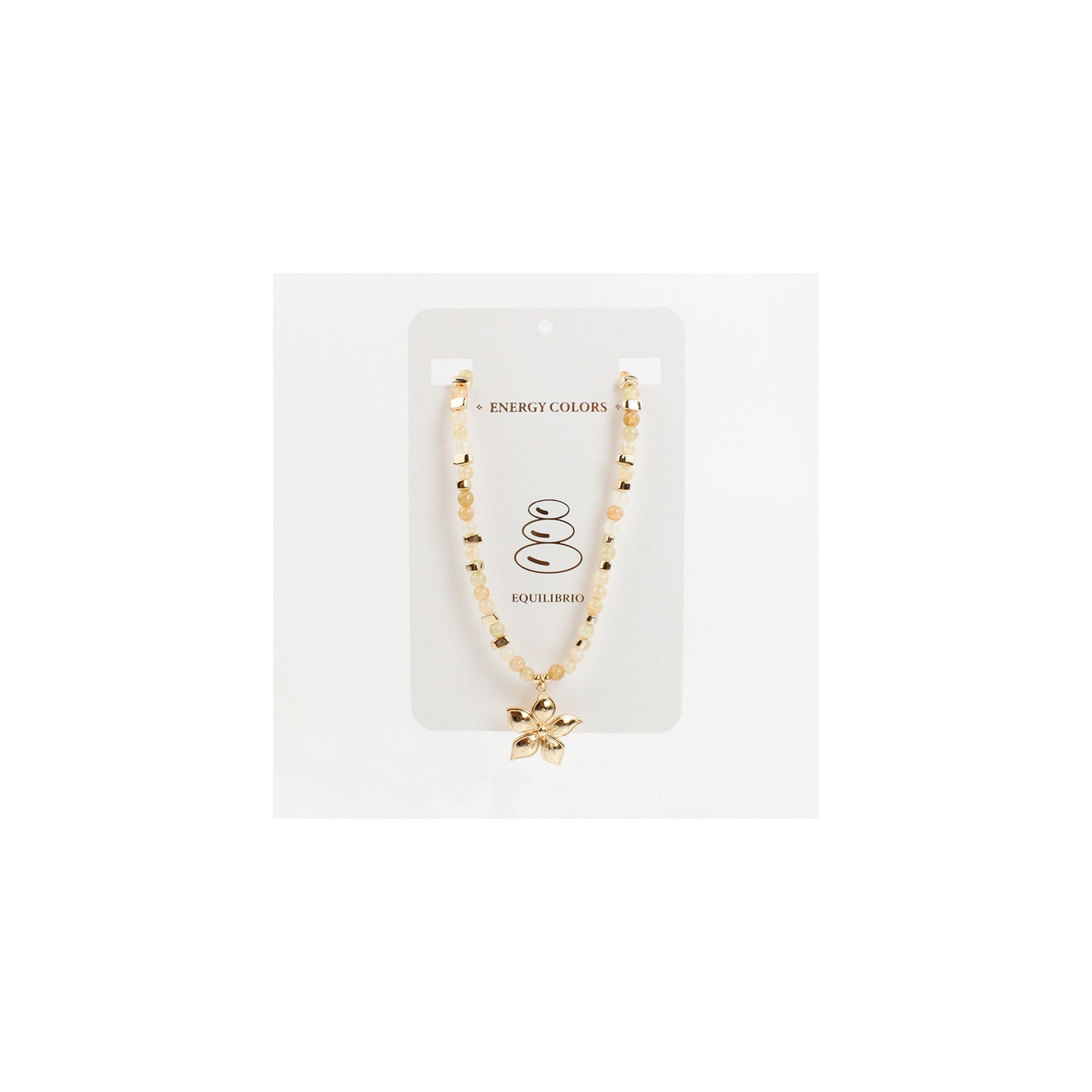 Collar flexible de lenga enhebrado con bolitas de vidrio energéticas estalladas, combinadas con piezas pasantes de CCB y dije exclusivo de fundición con forma de flor.
