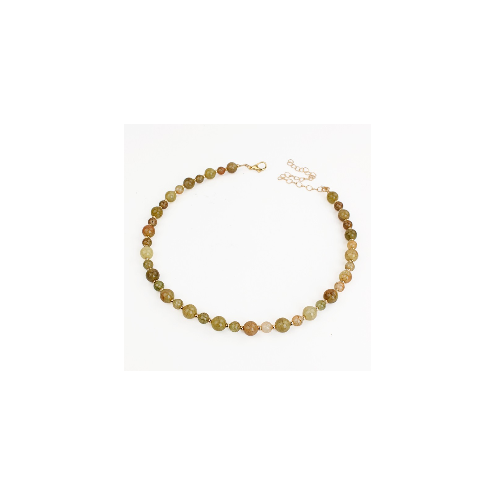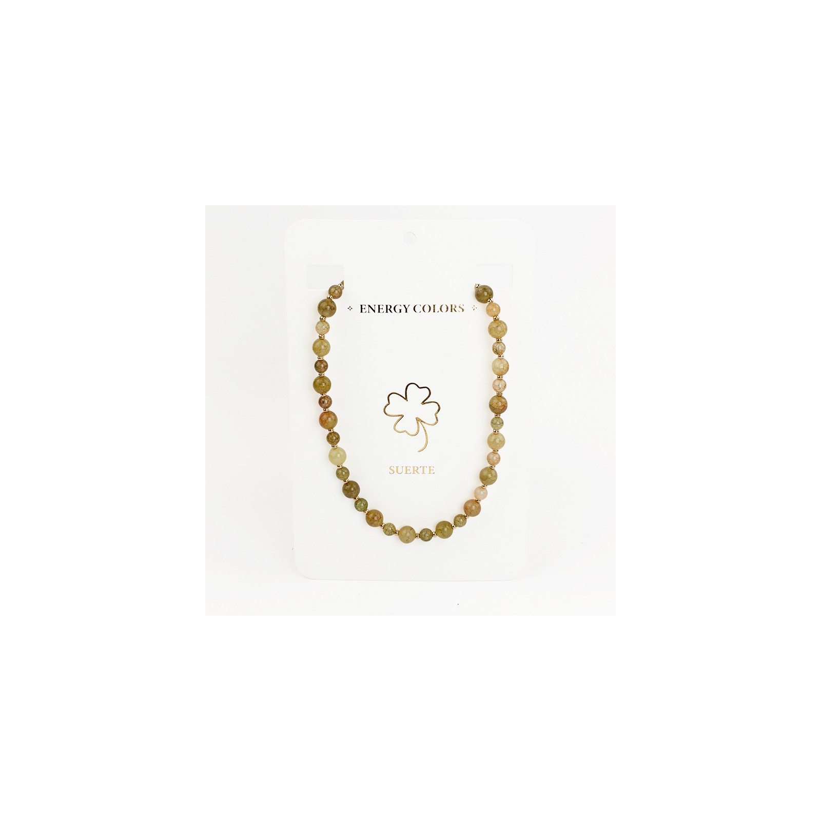 Collar flexible de lenga enhebrada con bolitas de vidrio energéticas de dos tamaños, combinadas con bolitas de CCB doradas.