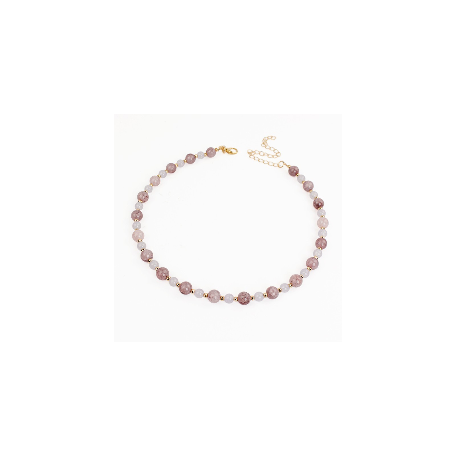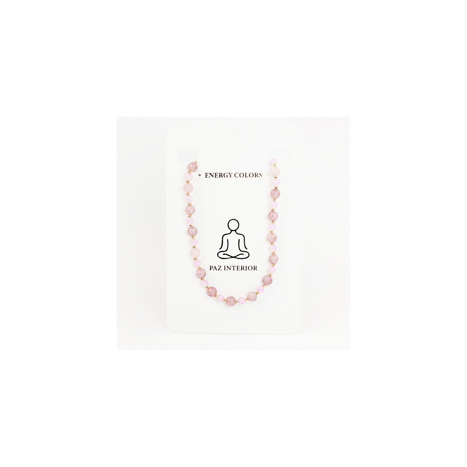 Collar flexible de lenga enhebrada con bolitas de vidrio energéticas de dos tamaños, combinadas con bolitas de CCB doradas.