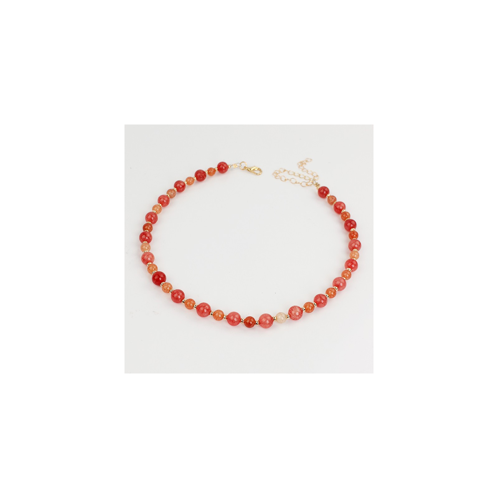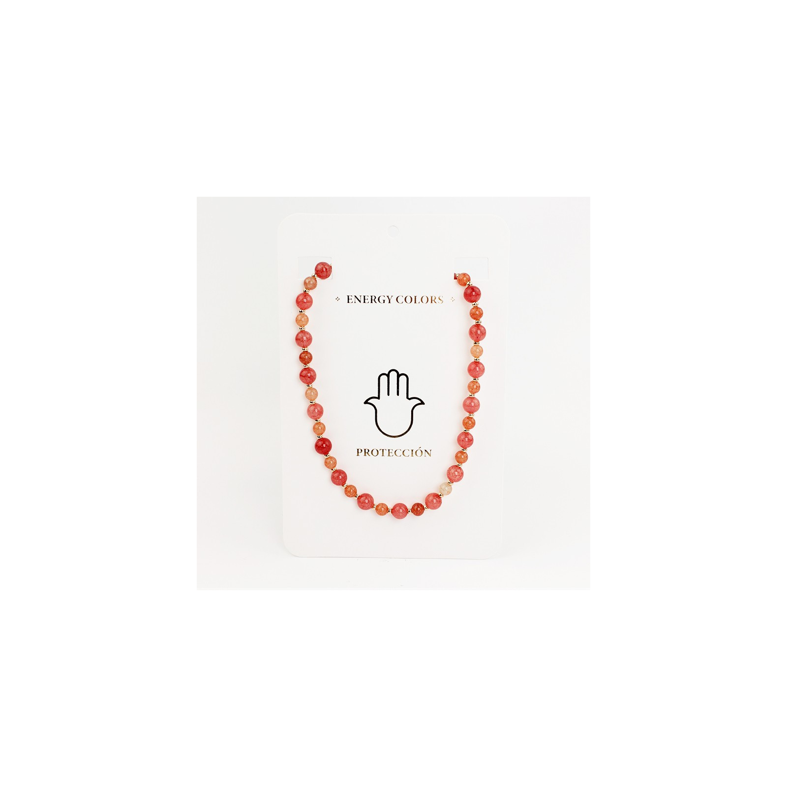 Collar flexible de lenga enhebrada con bolitas de vidrio energéticas de dos tamaños, combinadas con bolitas de CCB doradas.