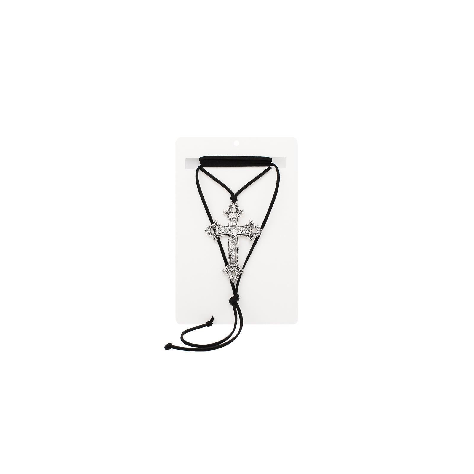 Collar corbatero de gamuza múltiples vueltas con dije exclusivo con forma de cruz labrada níquel.