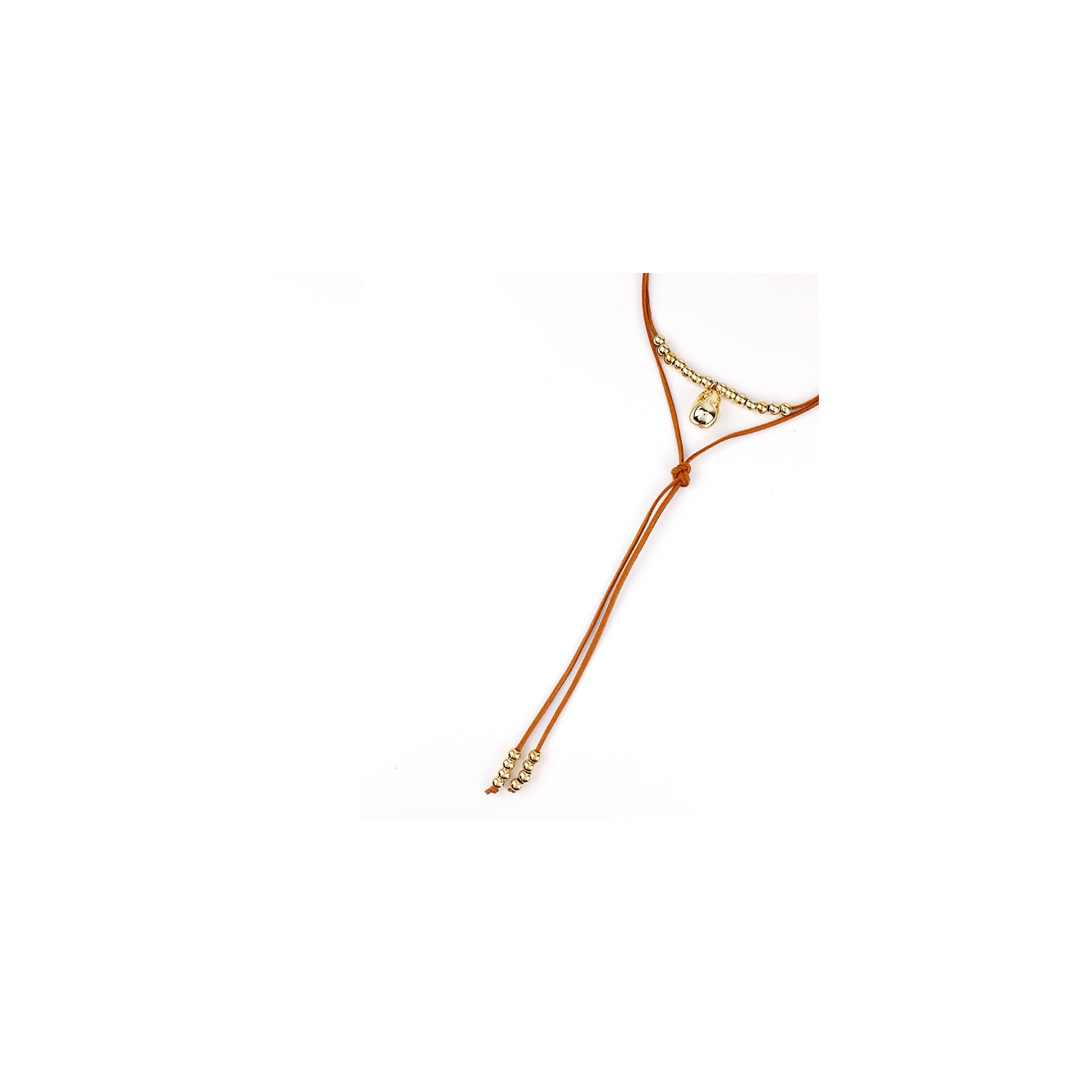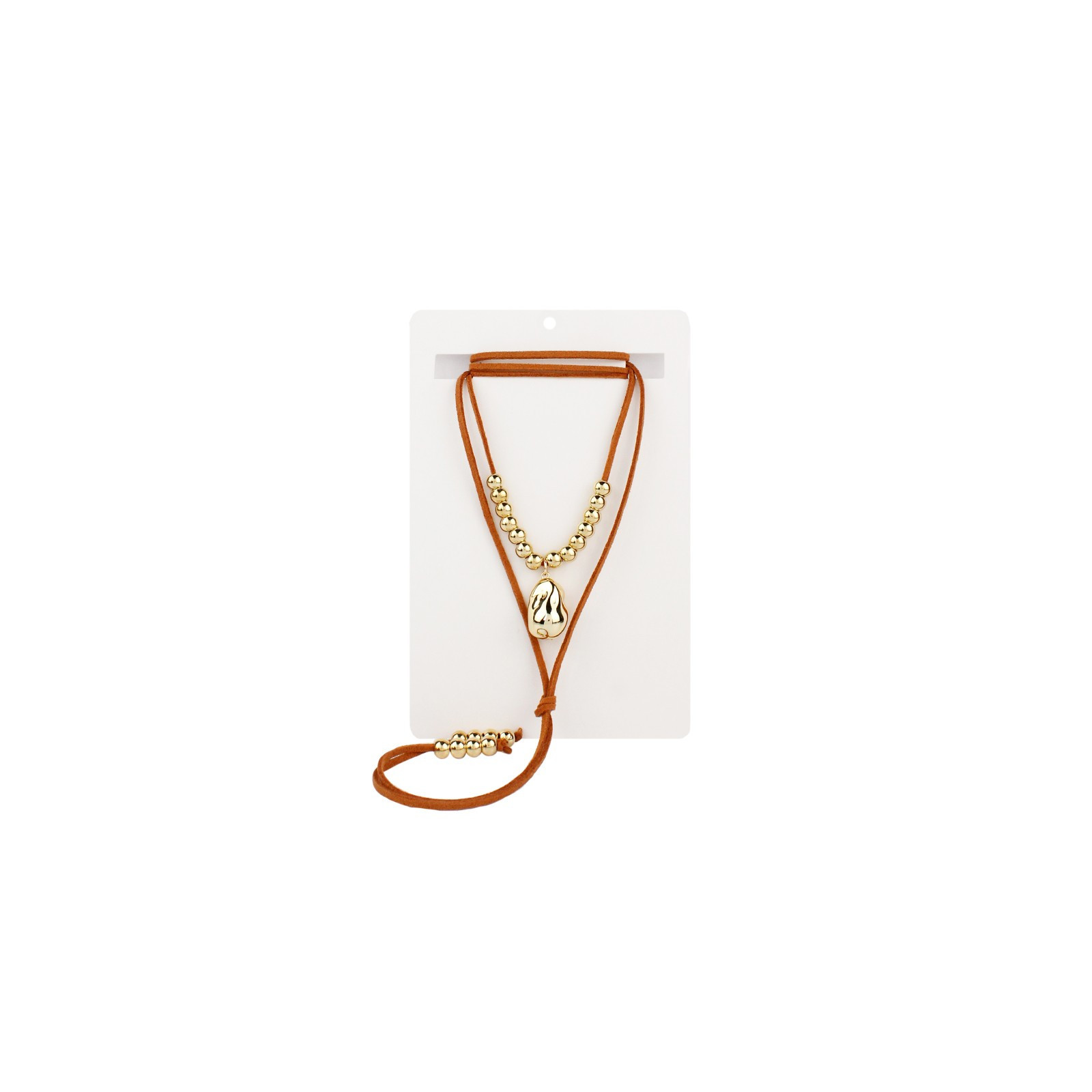 Collar de múltiples vueltas de gamuza, con piezas pasantes y dije exclusivo de ccb con forma de orgánica y terminales en punteras.