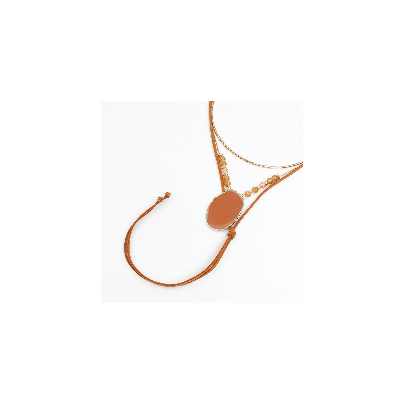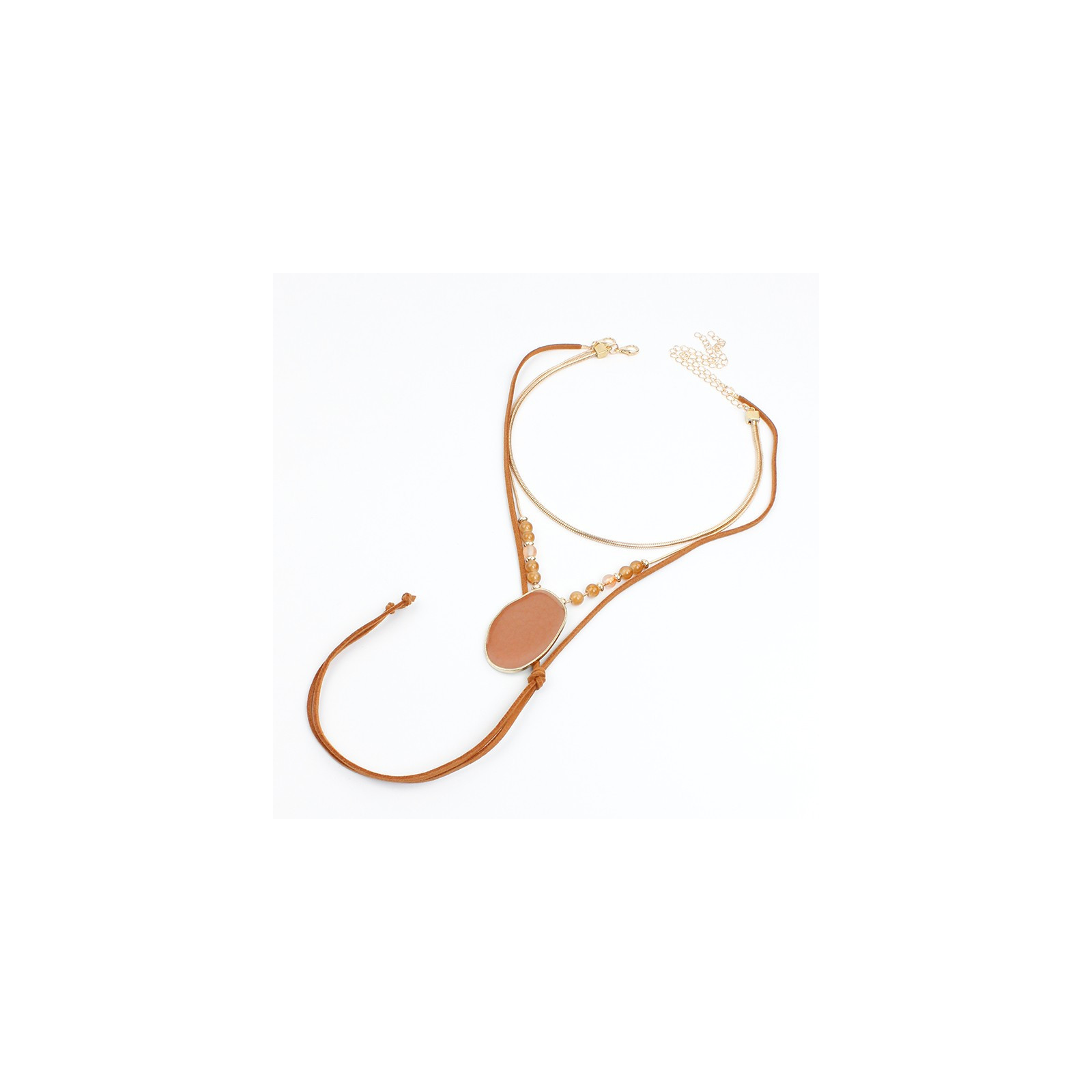 Collar dos en uno de doble caída de cadenas diferenciadas intervenida con bolitas de vidrio exclusivas y dije pintado a mano, acompañado de un collar corbatero de gamuza clásico.