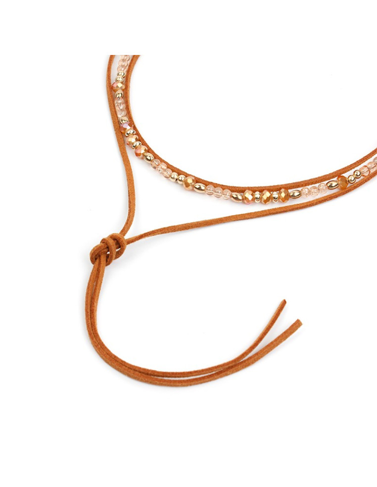 Collar corbatero de gamuza diferenciada y collar corto de piezas exclusivas de vidrio y roca de cristal.