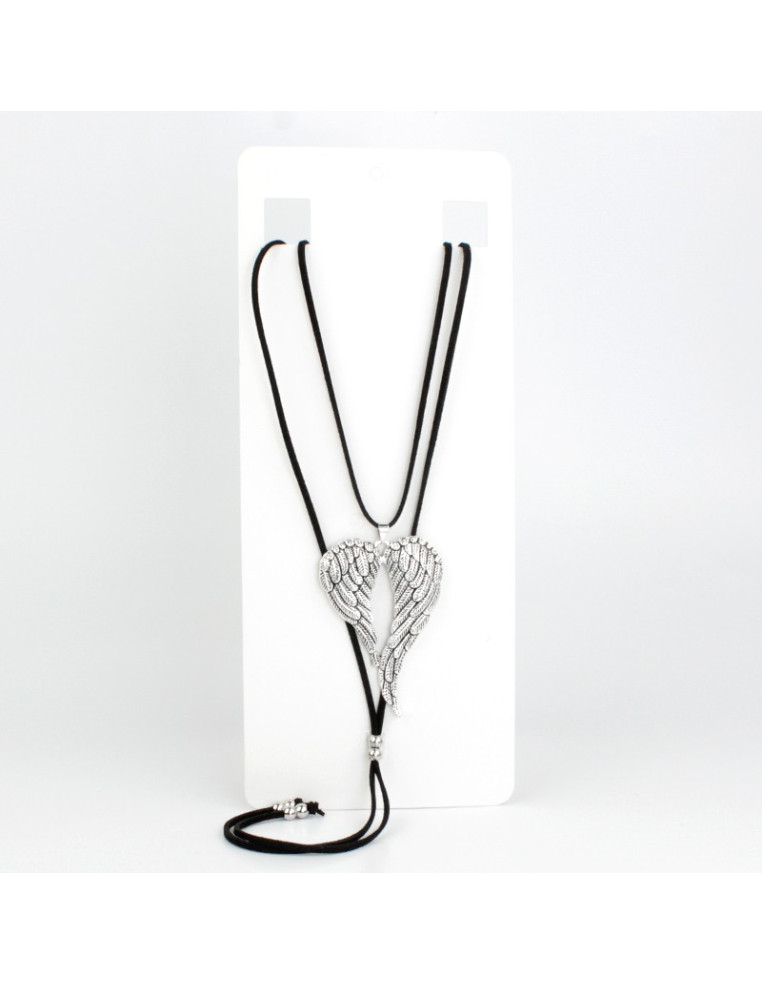 Collar corbatero de gamuza intervenido con dije exclusivo en forma de alas y bolitas pasantes de CCB.