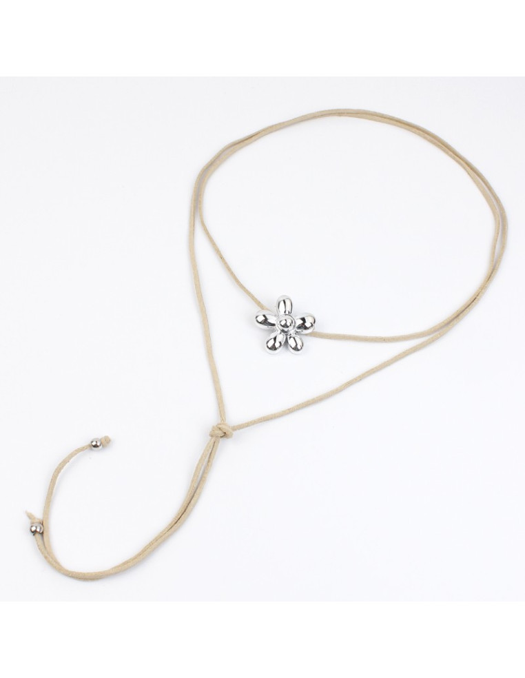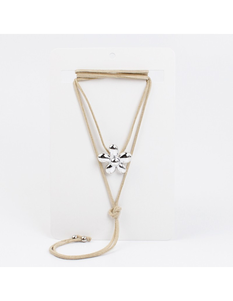 Collar de gamuza de múltiples vueltas, con dije exclusivo con forma de flor y terminales en punteras.