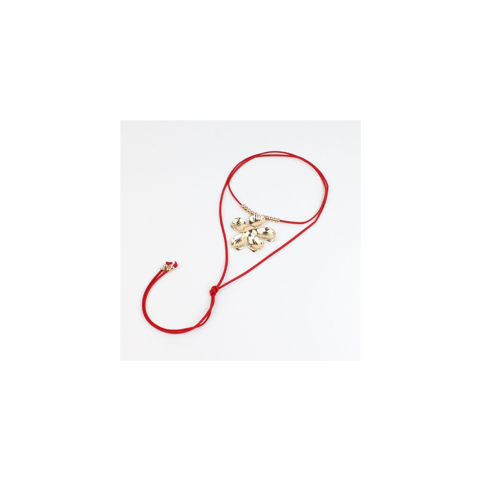 Collar de gamuza de múltiples vueltas, con dije exclusivo de chapa con forma de flor y terminales en punteras.
