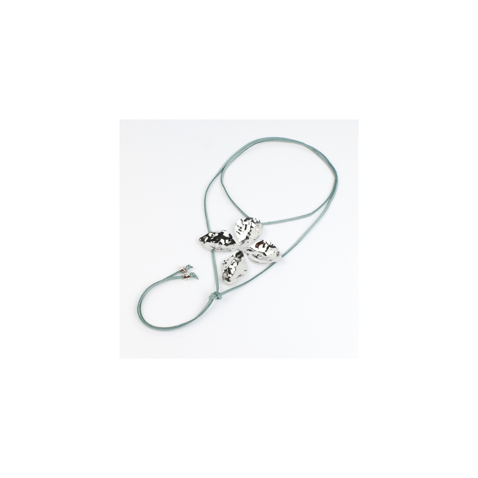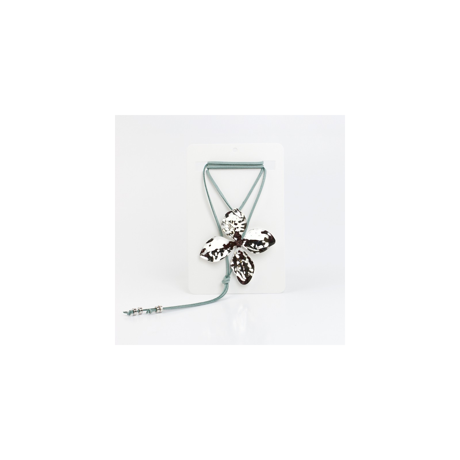 Collar de gamuza de múltiples vueltas, con dije exclusivo de chapa con forma de flor níquel y terminales en punteras.