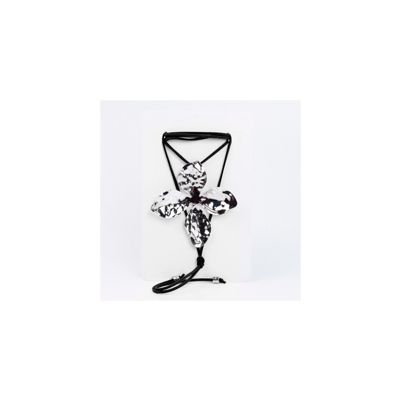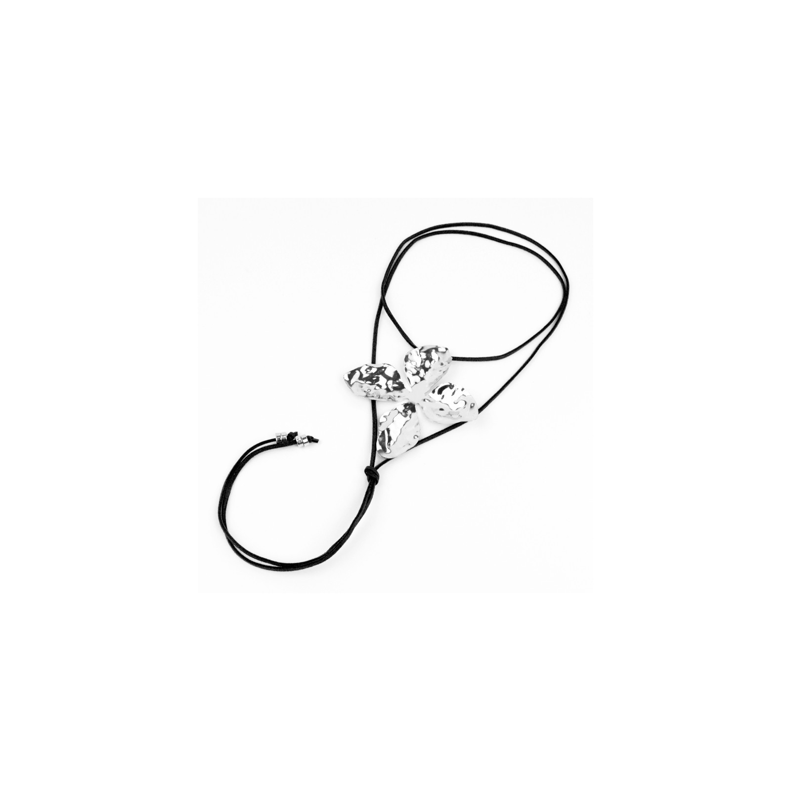 Collar de gamuza de múltiples vueltas, con dije exclusivo de chapa con forma de flor níquel y terminales en punteras.