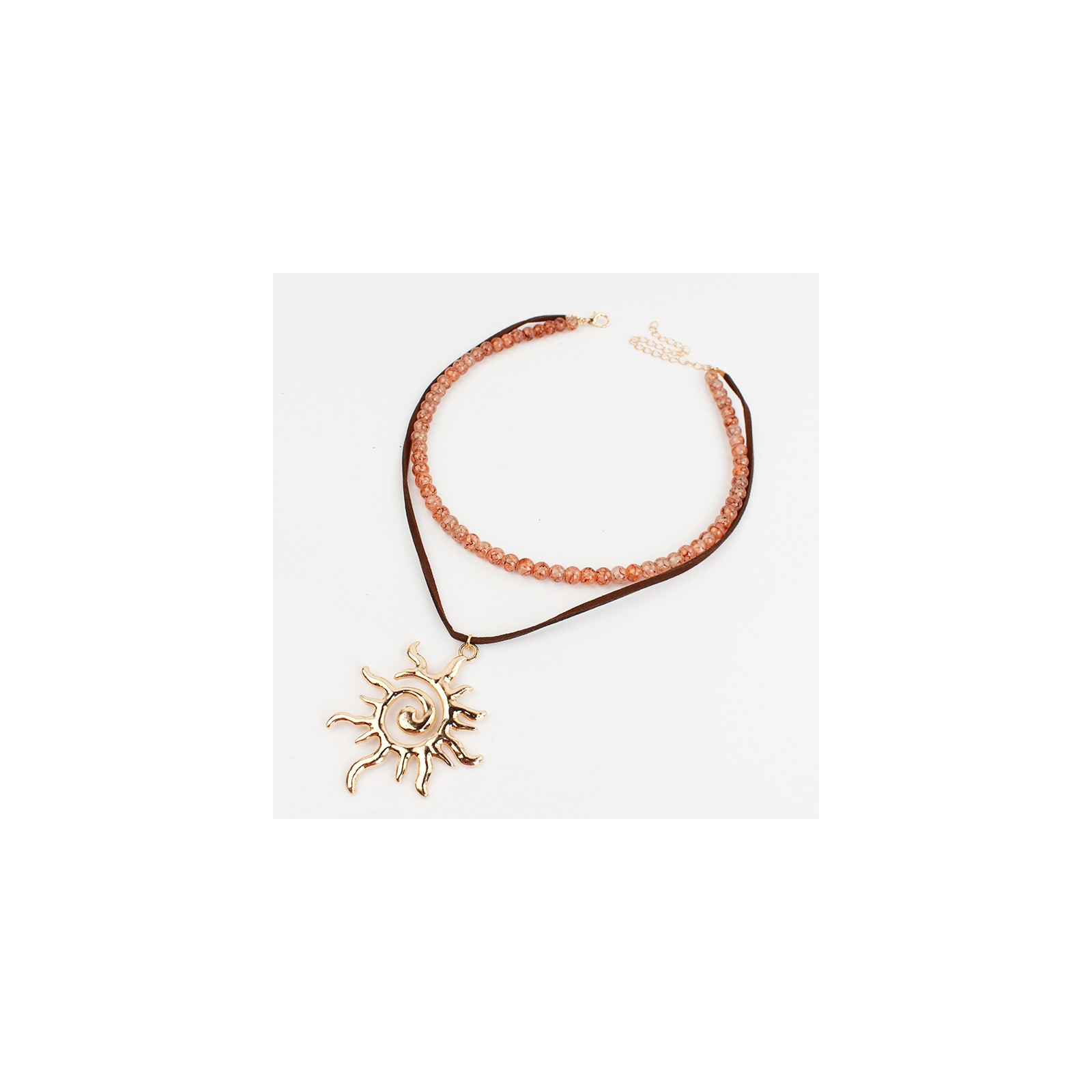 Collar combinado de lenga enhebrada con piezas de vidrio diferenciadas y cordón de gamuza con dije exclusivo de fundición con forma de sol.
