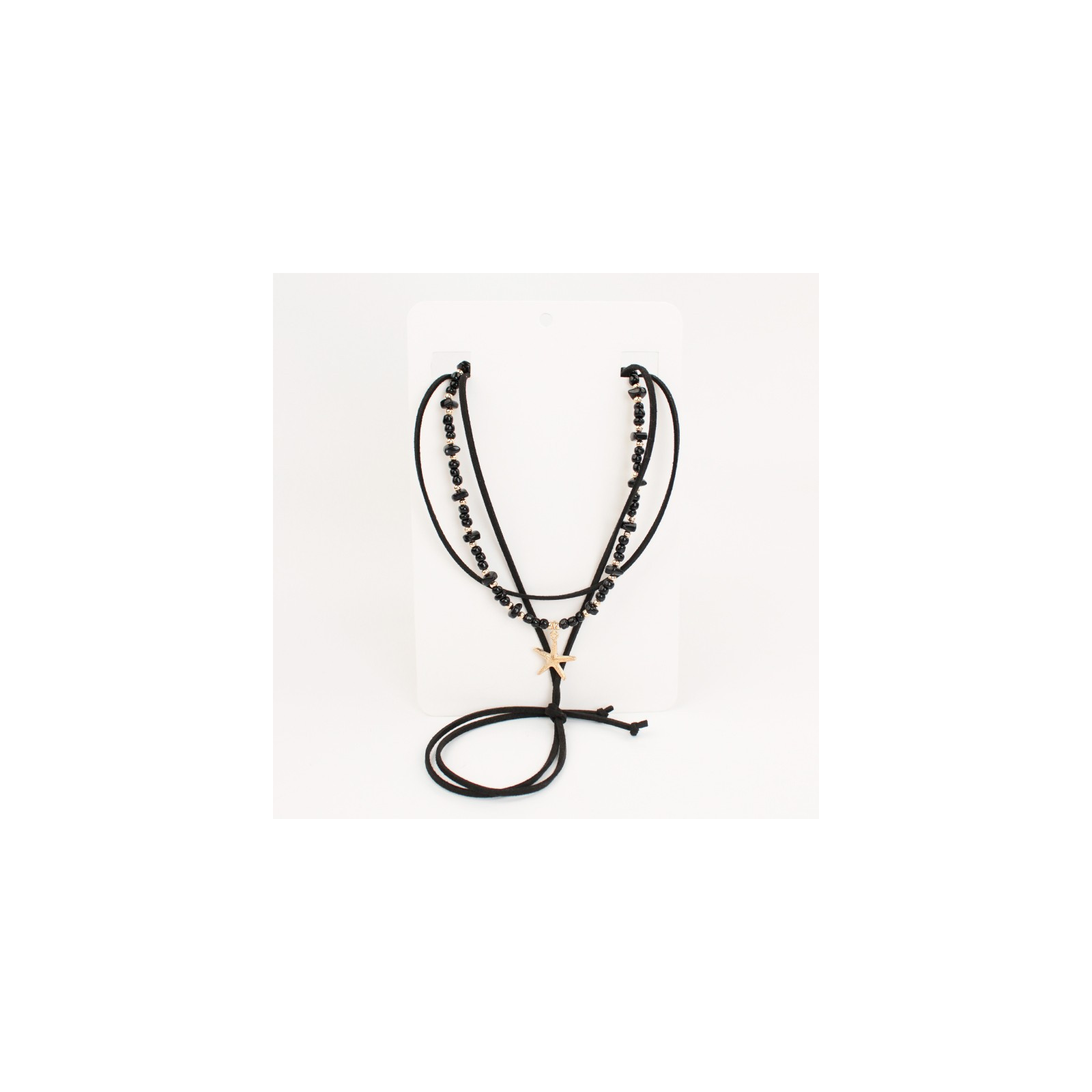 Set de dos collares, uno flexible de lenga enhebrada con mostacillas, combinadas con escallas de acrílico y separadores de CCB con dije de fundición con forma de estrella de mar, otro de gamuza.