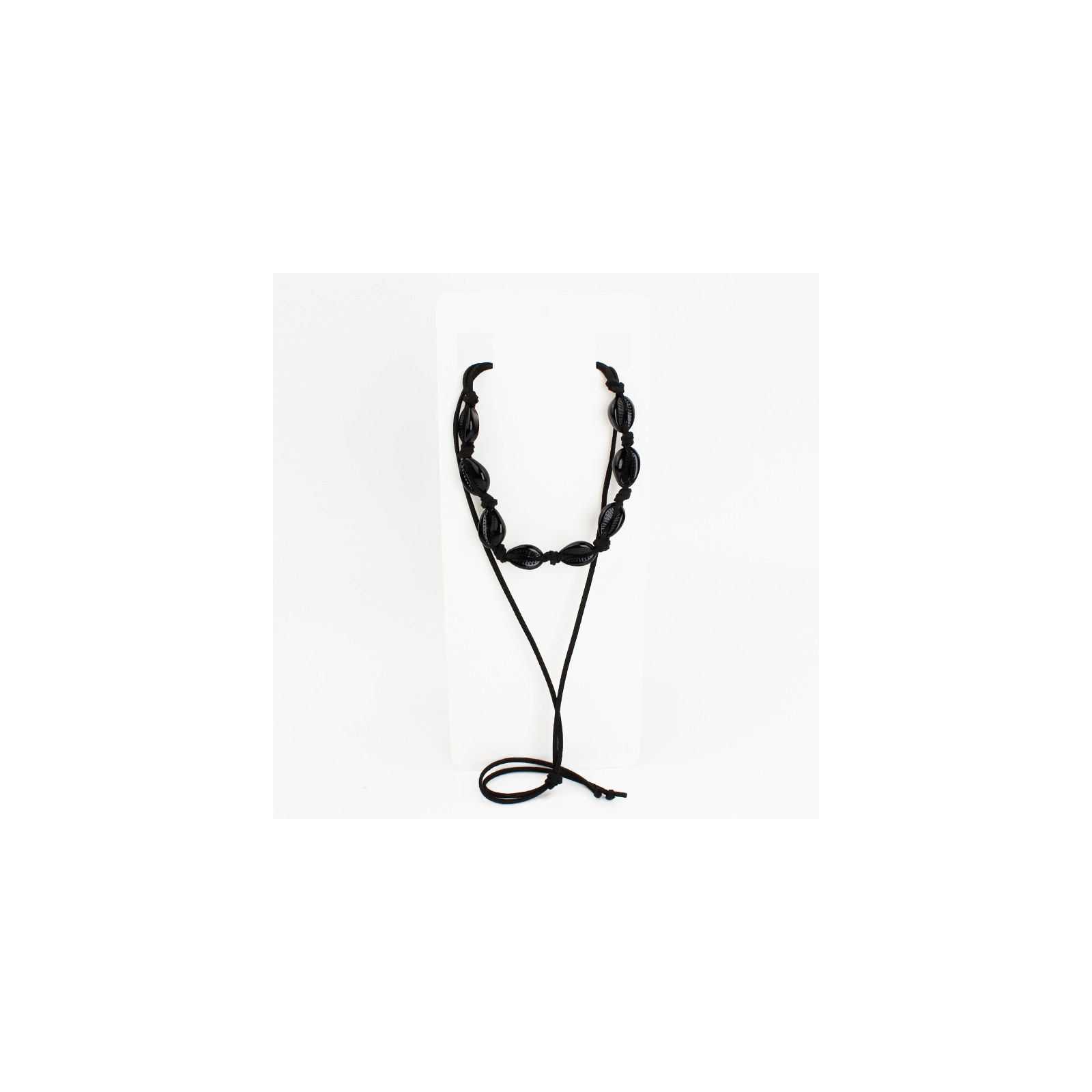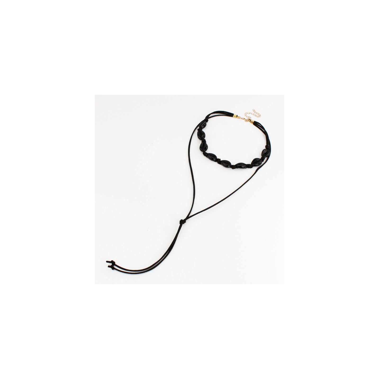 Collar corbatero de doble caída de gamuzas, una de ellas enhebrada con buzios entrelazados.