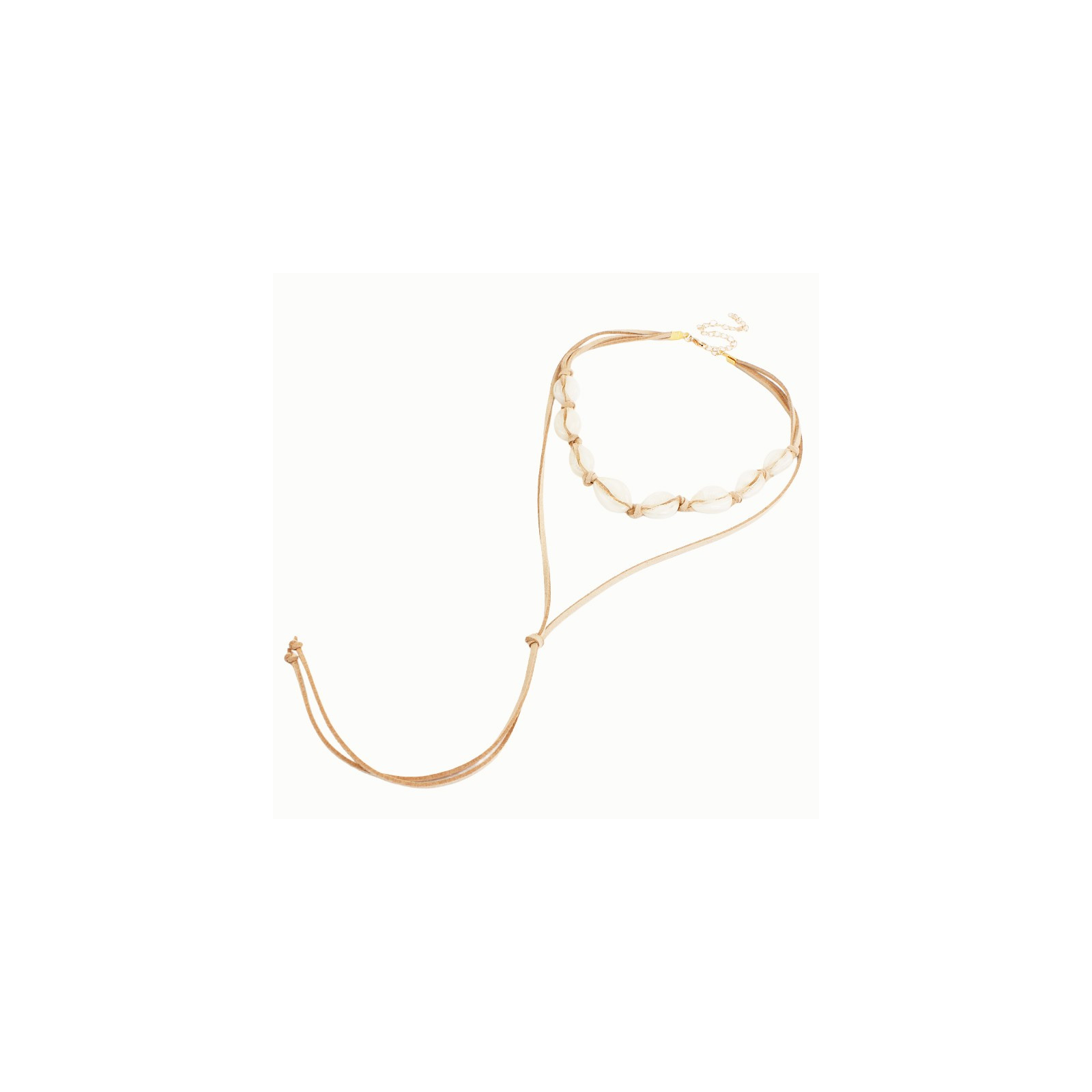 Collar corbatero de doble caída de gamuzas, una de ellas enhebrada con buzios entrelazados.