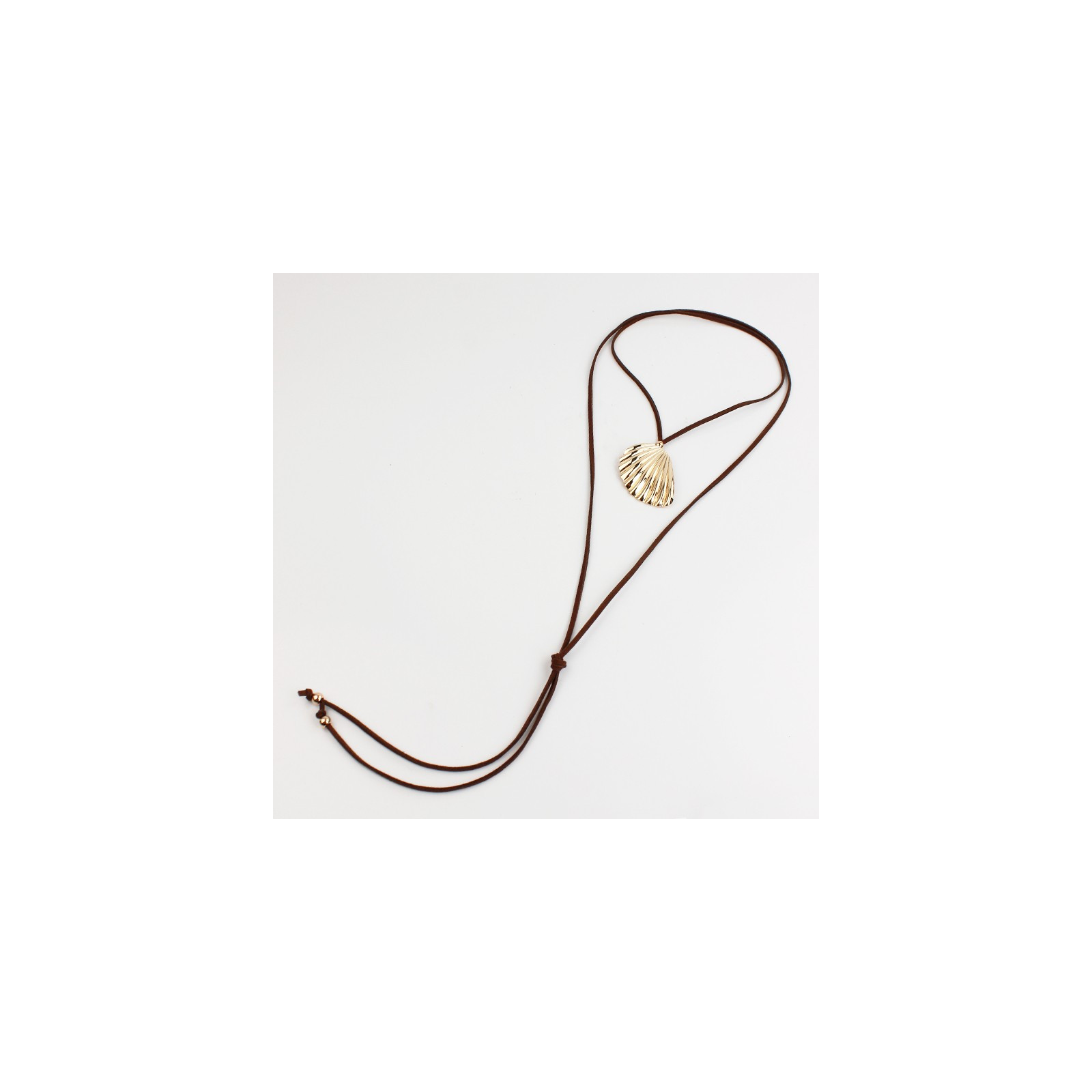 Collar de gamuza de múltiples vueltas, con dije exclusivo de metal con forma de ostra y terminales en punteras.