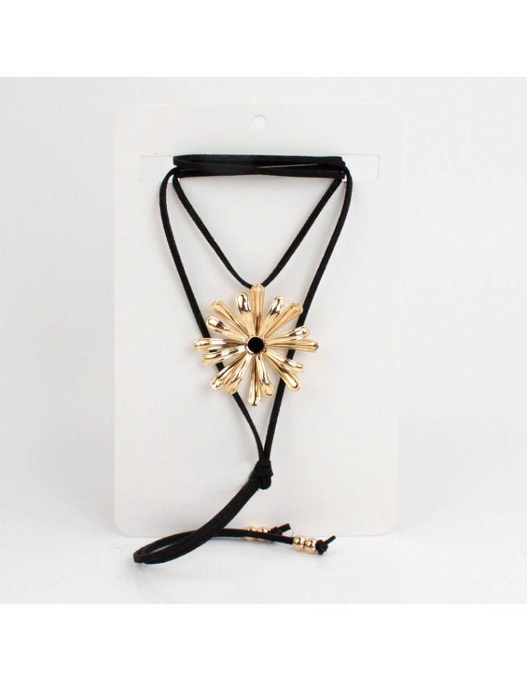 Collar de gamuza de múltiples vueltas, con dije exclusivo de metal con forma de flor pintada a mano y terminales en punteras.