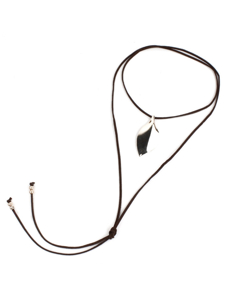 Collar de gamuza de múltiples vueltas, con dije exclusivo de metal y terminales en punteras.