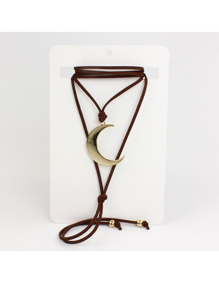 Collar de gamuza de múltiples vueltas, con dije exclusivo de fundición con forma de luna y terminales en punteras.