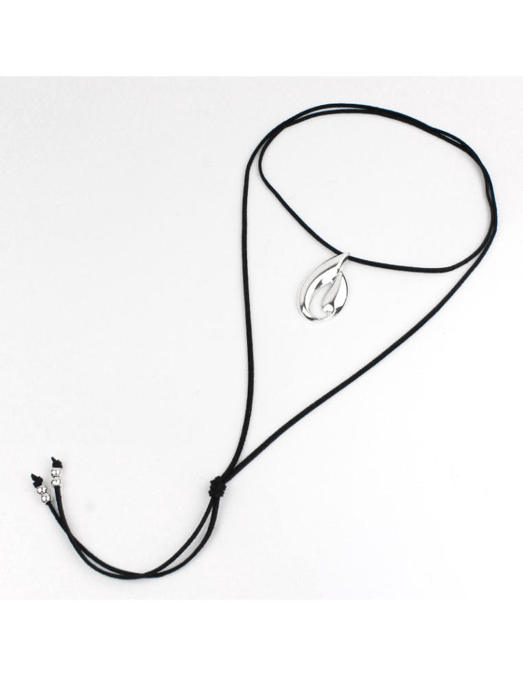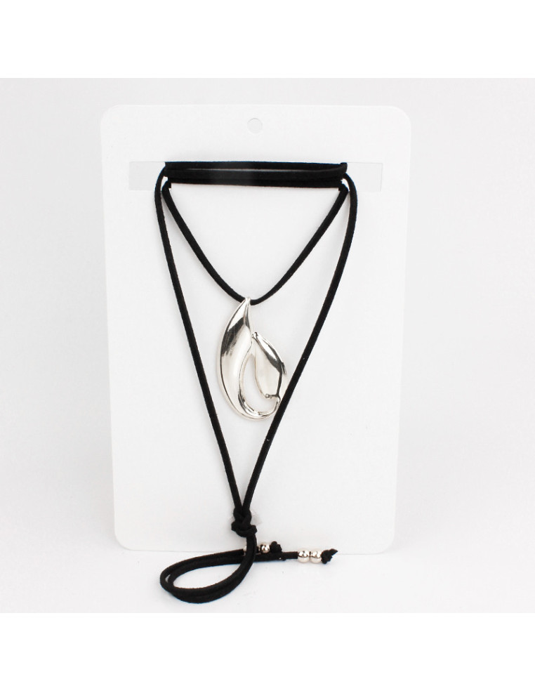Collar de gamuza de múltiples vueltas, con dije exclusivo de metal níquel y terminales en punteras. Medida: 140cm de largo.