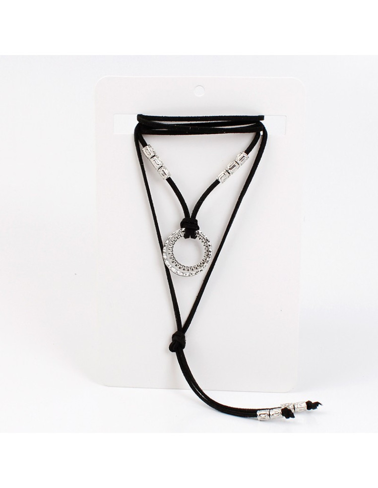 Collar de gamuza de múltiples vueltas, con dijes exclusivos circulares boho y terminales en punteras.