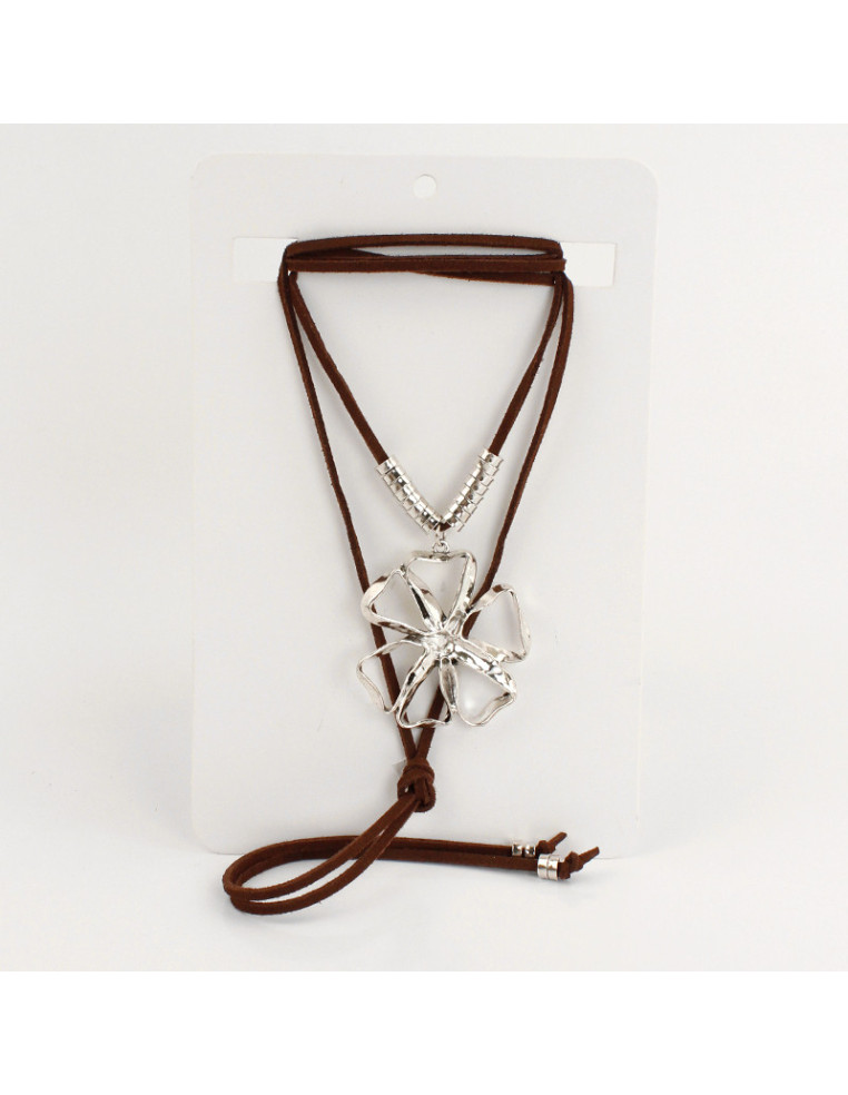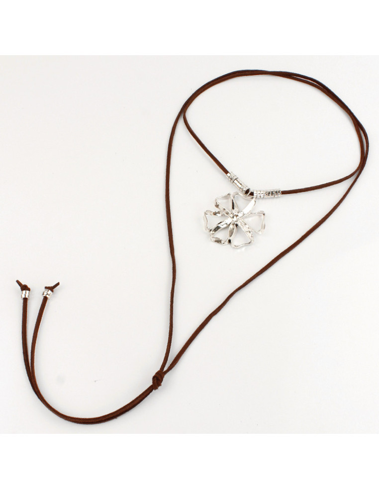 Collar de gamuza de múltiples vueltas, con dije exclusivo de fundición con forma de flor y terminales en punteras.