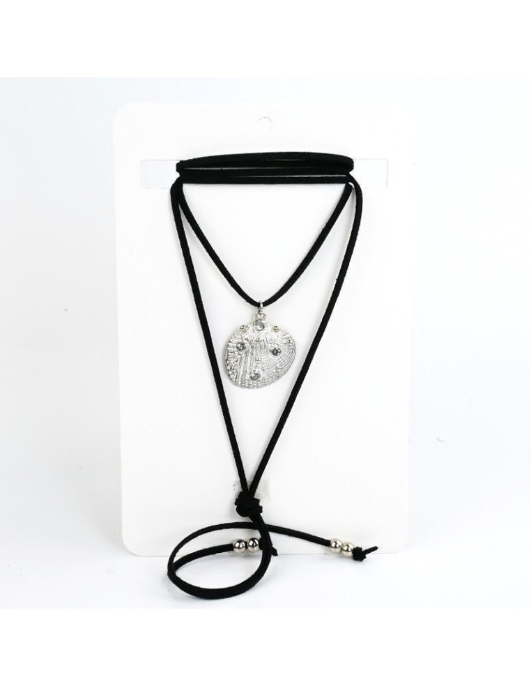Collar de gamuza de múltiples vueltas, con dije exclusivo de fundición con forma de carazón y strass, con terminales en punteras. Medida: 140cm de largo.