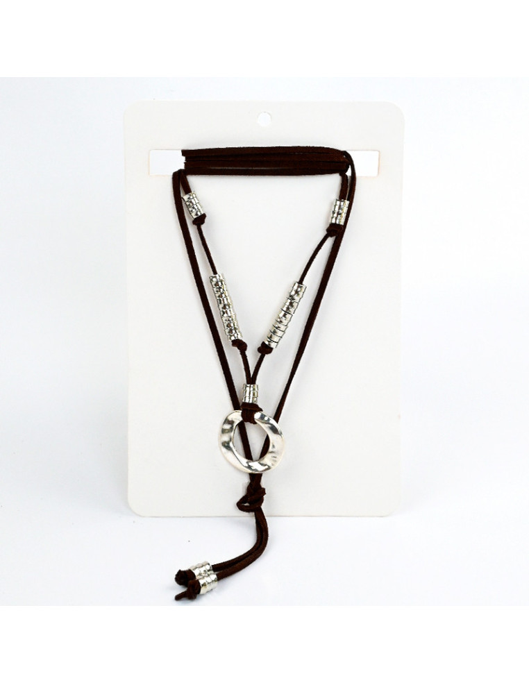Collar de gamuza de múltiples vueltas, con dije exclusivo de fundición orgánico, separadores enhebrados y terminales en punteras. Medida: 140cm de largo.