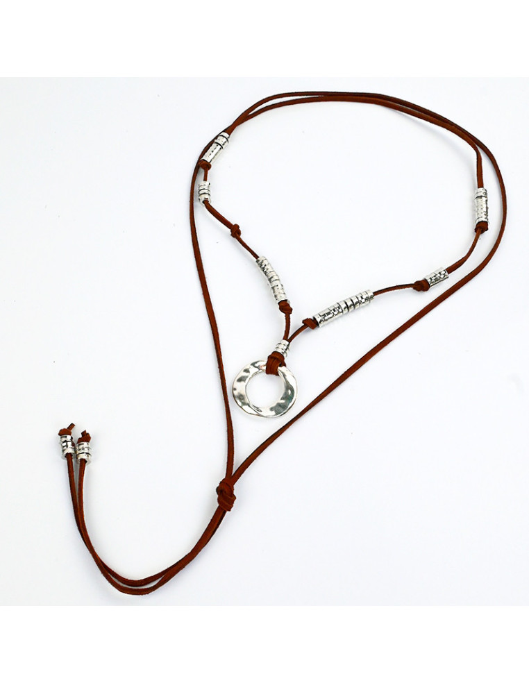 Collar de gamuza de múltiples vueltas, con dije exclusivo de fundición orgánico, separadores enhebrados y terminales en punteras. Medida: 140cm de largo.