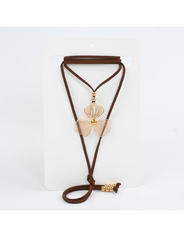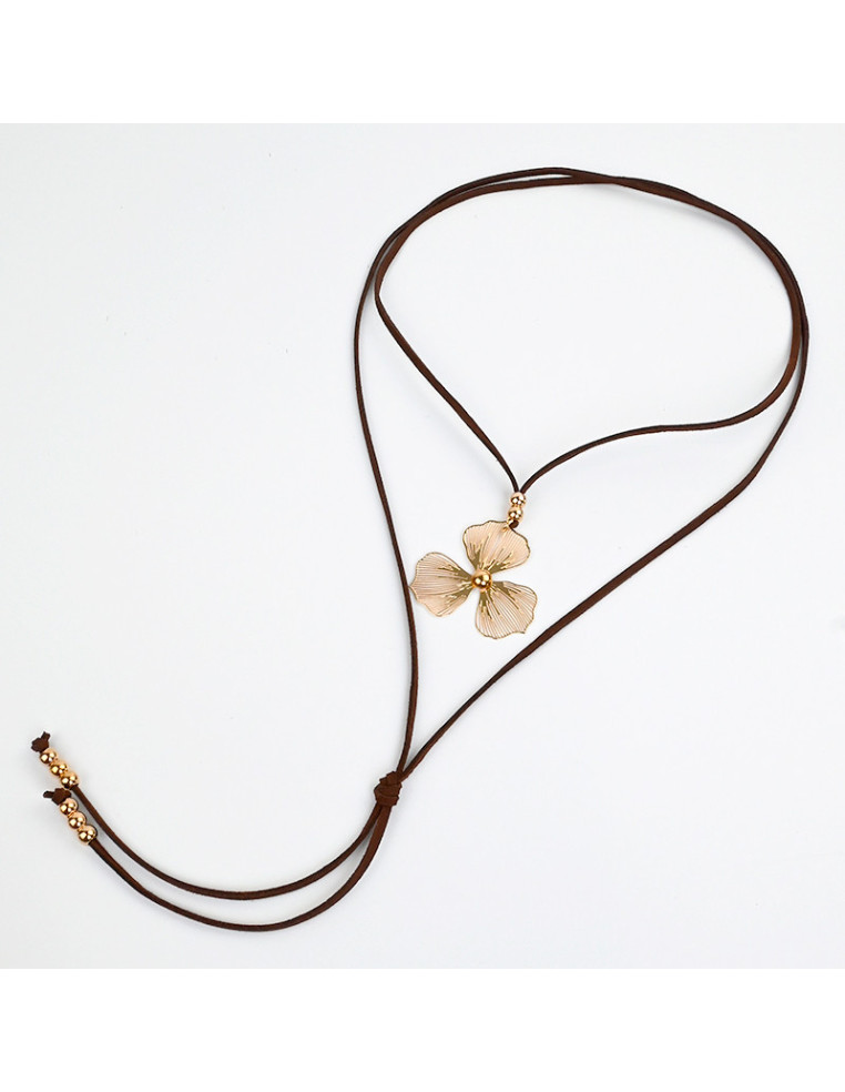 Collar de gamuza de múltiples vueltas, con dije exclusivo de metal con forma de flor calada y terminales en punteras.