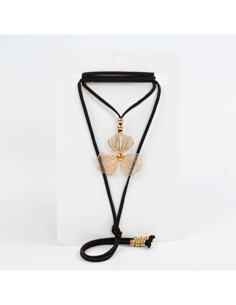 Collar de gamuza de múltiples vueltas, con dije exclusivo de metal con forma de flor calada y terminales en punteras.
