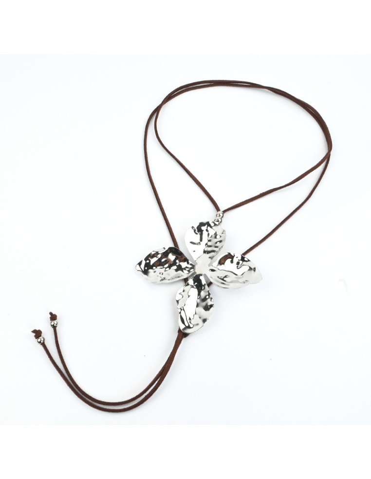 Collar de gamuza de múltiples vueltas, con dije exclusivo de metal con forma de flor y terminales en punteras.