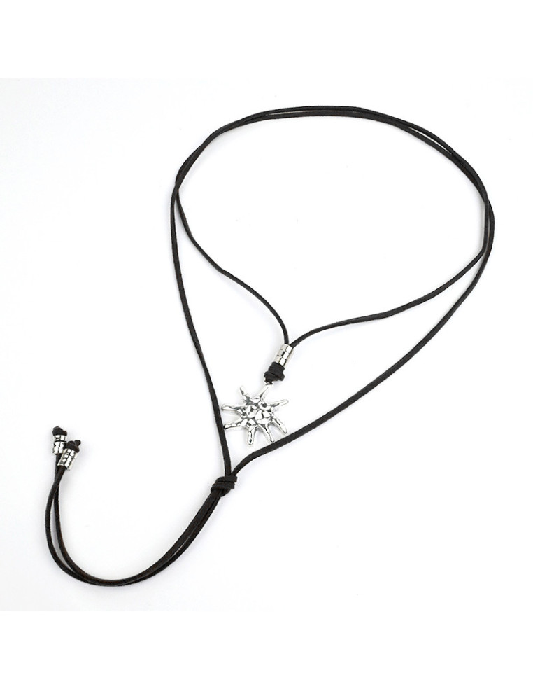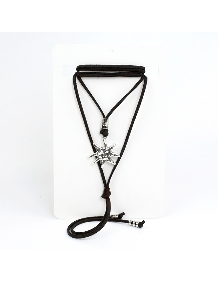 Collar de gamuza de múltiples vueltas, con dije exclusivo de fundición con forma de sol diferenciado y terminales en punteras. Medida: 140cm de largo.