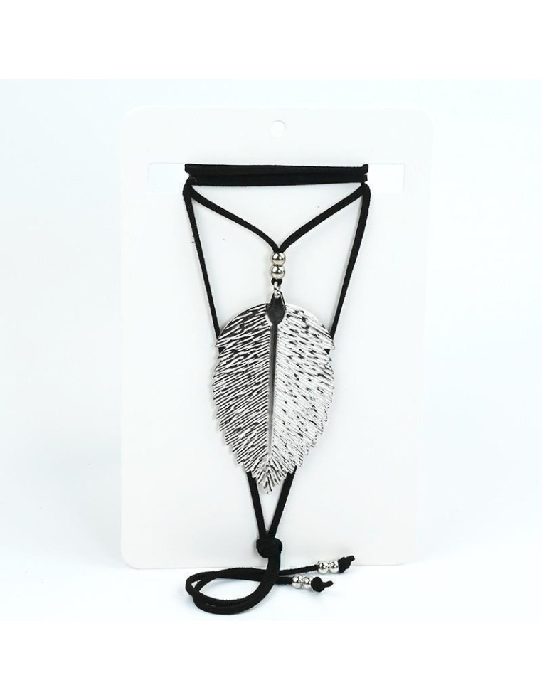 Collar de gamuza de múltiples vueltas, con dije exclusivo de metal con forma de hoja y terminales en punteras.