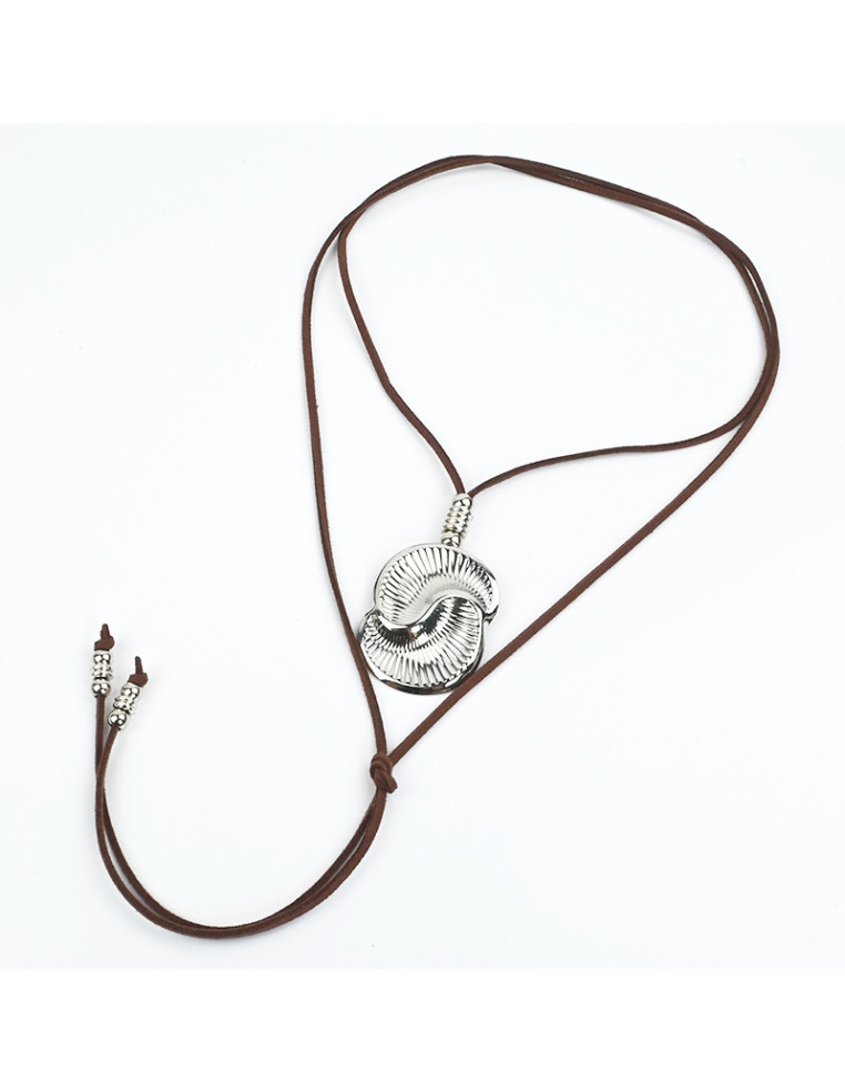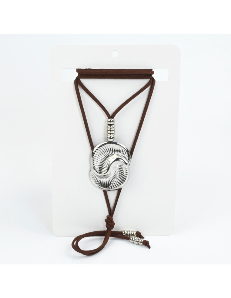 Collar de gamuza de múltiples vueltas, con dije exclusivo de  metal de forma orgánica y terminales en punteras.