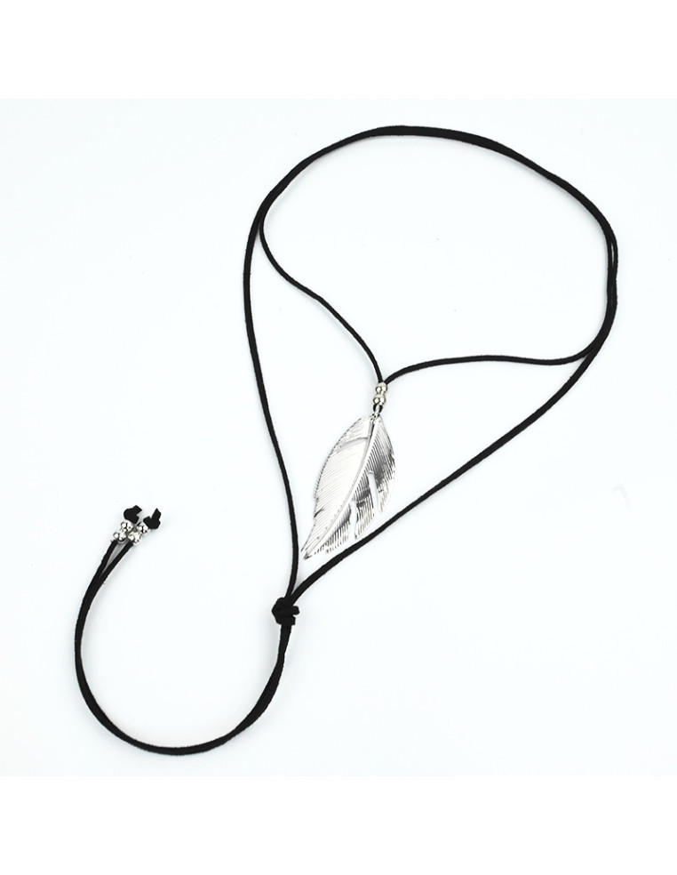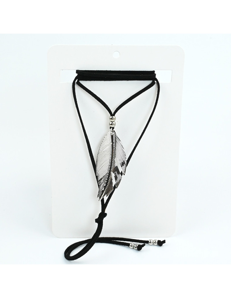 Collar de gamuza de múltiples vueltas, con dije exclusivo de metal con forma de pluma y terminales en punteras.