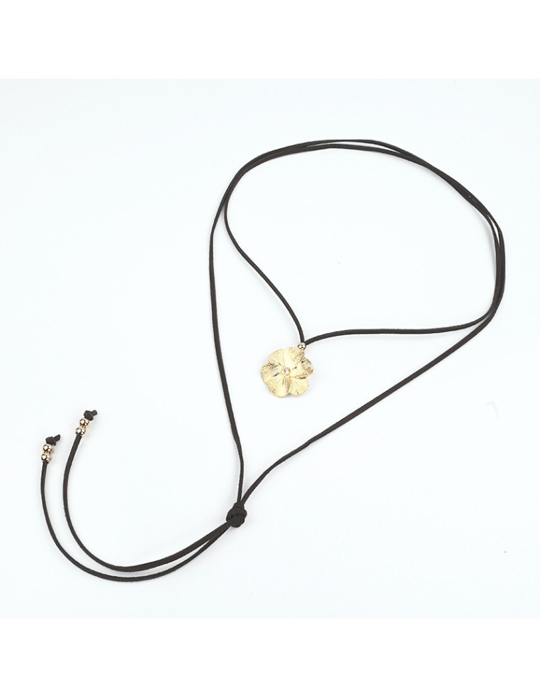 Collar de gamuza de múltiples vueltas, con dije exclusivo de metal con forma de flor y terminales en punteras.