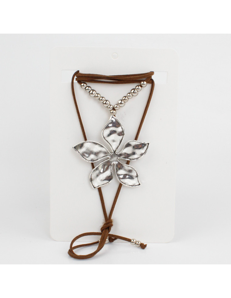 Collar de gamuza de múltiples vueltas, con dije exclusivo de fundición con forma de flor y terminales en punteras.